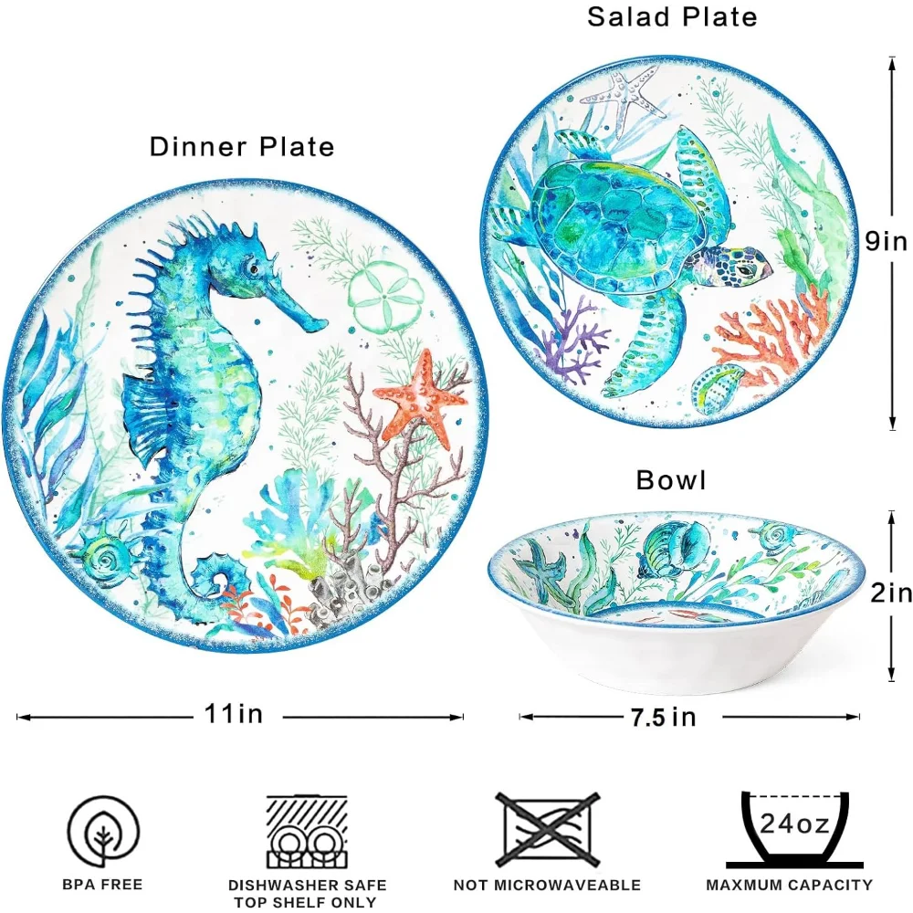 12-Piece Melamine Beach Dinnerware Set, Coastal Plates and Bowls Sets, Oceanic Sea Life Dish Sets for 4, Great for Indoor