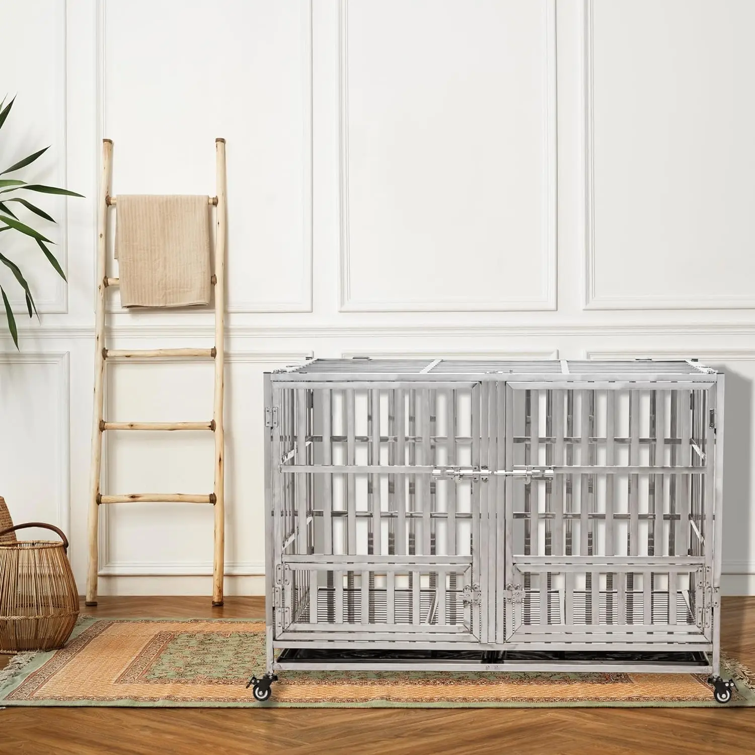 42" Stainless Steel Dog Cage & Playpen - Heavy Duty, Indoor/Outdoor Kennel Crate for Large Dogs w/Double Doors/Locks, Lo