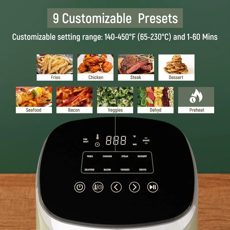 - 9 IN 1 MEET ALL YOU NEEDS: Large advanced digital screen features 9 preset modes (Fries, Chicken, Steak, Dessert, Seafood, Bacon,Veggies, Dehyd, Preheat. You can adjust time (1~60 mins) and temp(150℉~450 ℉) for customizing everything to fit your air fried recipes. And the Shake Reminder lets you know when to shake your food for cooking it more evenly and crispy textures.
