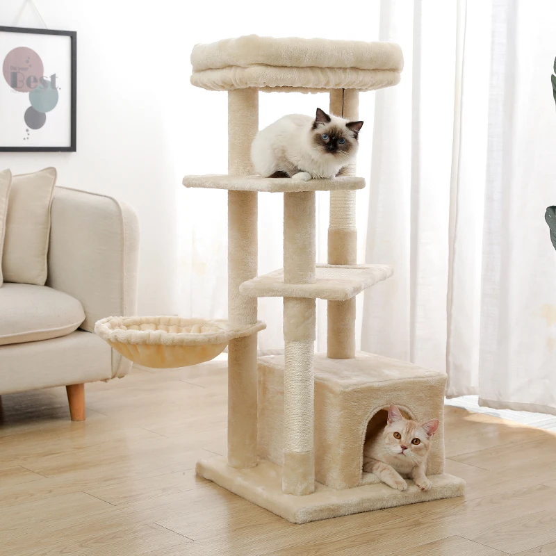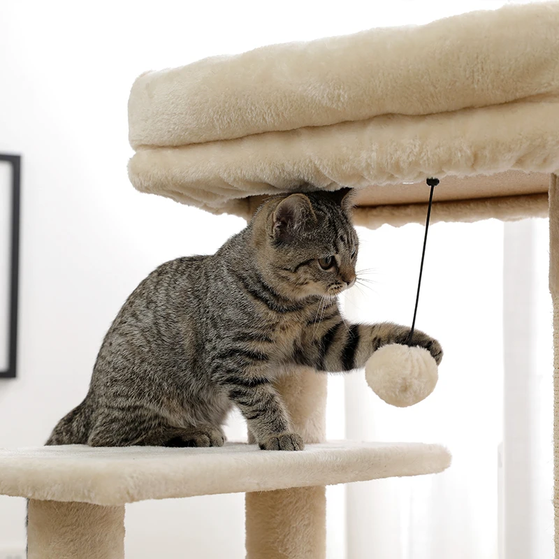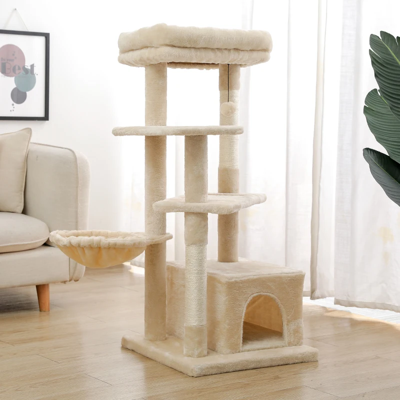 Ideal design of structure: Structure of the cat tree is designed according the climbing habits of cats. A springboard is add to help any age range cats to climb up and down