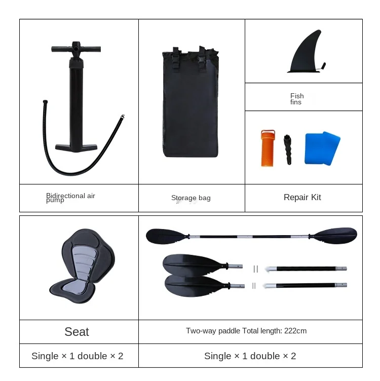 Package include: pump, paddle, seat, fin, backpack, waterproof bag