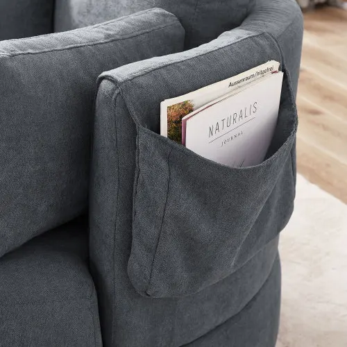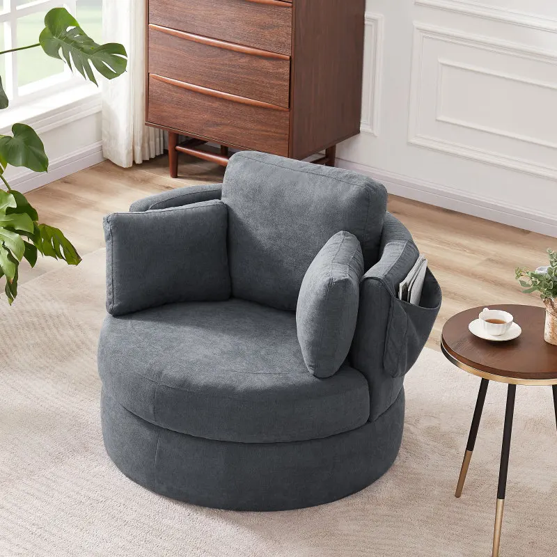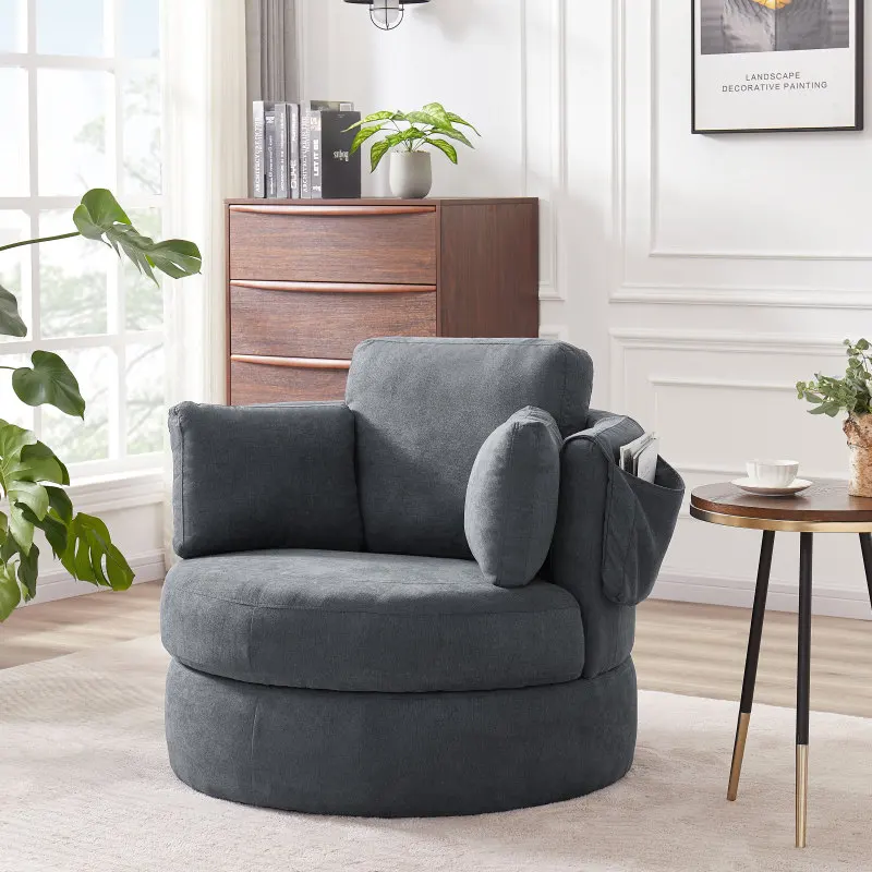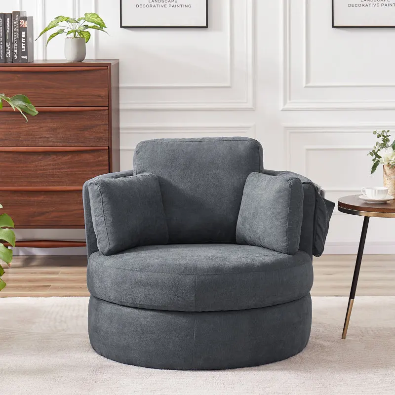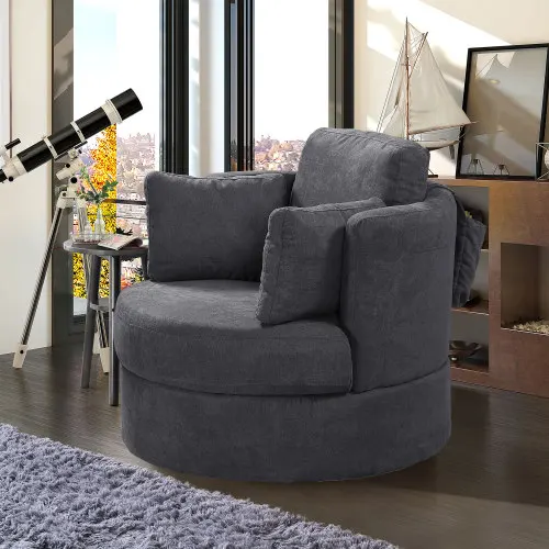 Dark Grey Swivel Accent Barrel Modern Sofa Lounge Club Round Chair Linen Fabric for Living Room Hotel with 3 Pillows and storage
