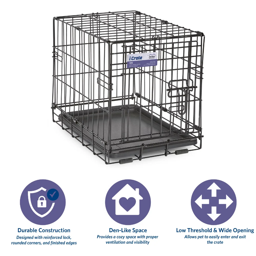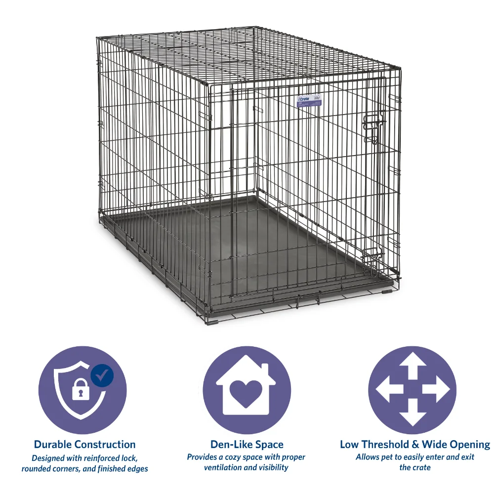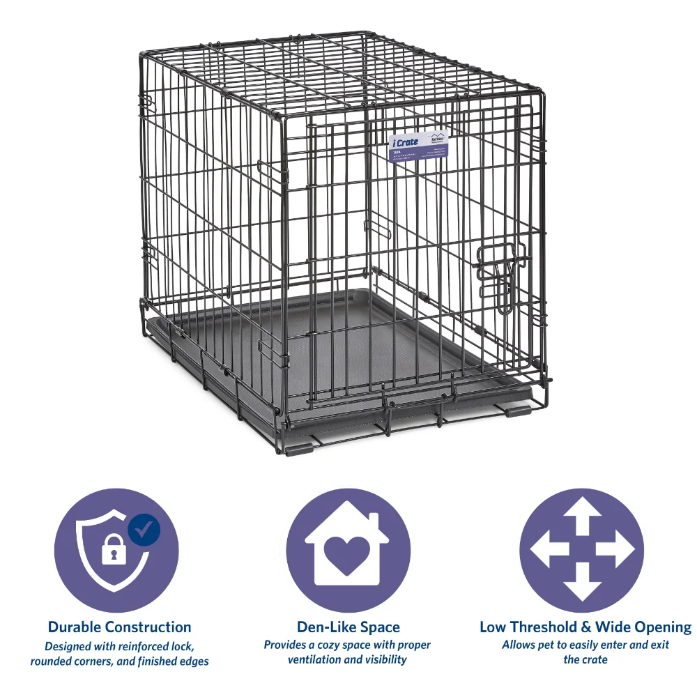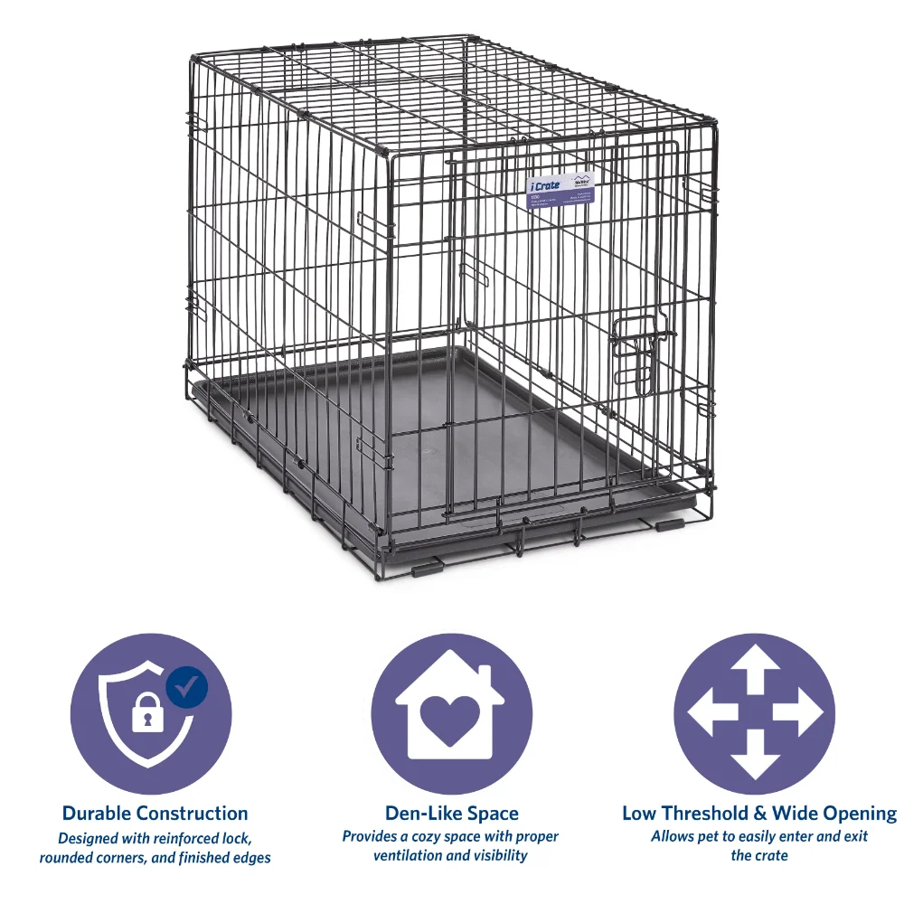 - Dog crate includes a divider panel, durable & leak-proof plastic pan, protective rubber feet, carrying handle, and customer support team based in Indiana|Easy to assemble & portable | Dog crate sets up in seconds with no tools required and conveniently folds flat for travel, Durable & strong, quality construction creates a secure place for your dog to fulfill their natural instinct to den. Proper ventilation, large door openings with low thresholds, and patented rounded corner clips make iCrate a safer crate experience for your dog