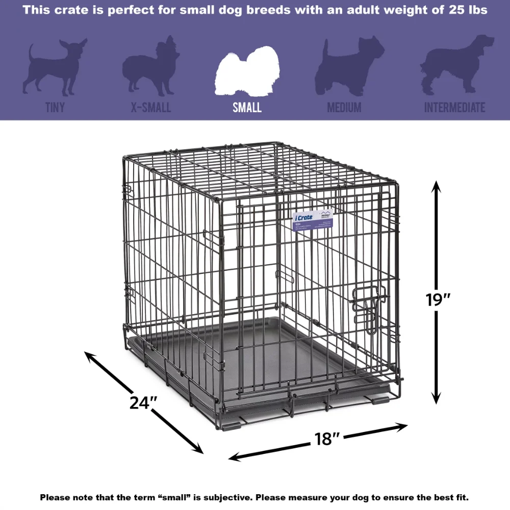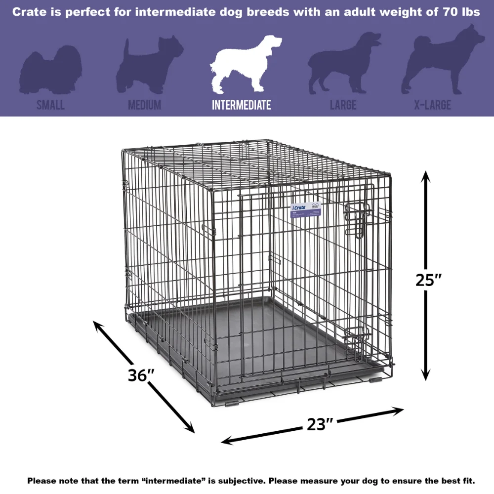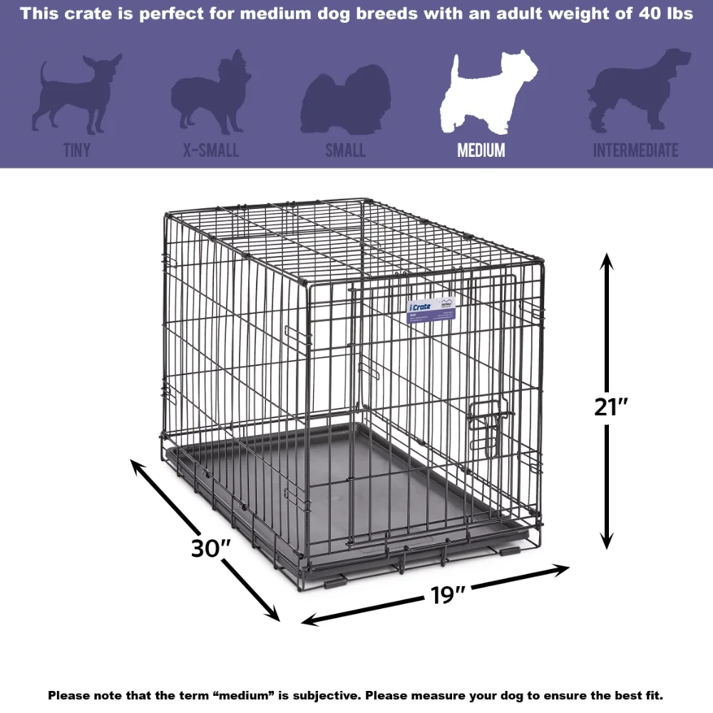 - iCrate double door dog crate measures 30L x 19 x 21 inches and is suitable for medium dog breeds with an adult weight of 25 to 40 pounds. If your dog's weight or measurements are on the higher side for this crate, we recommend buying the next crate size up. When in doubt, bigger is better