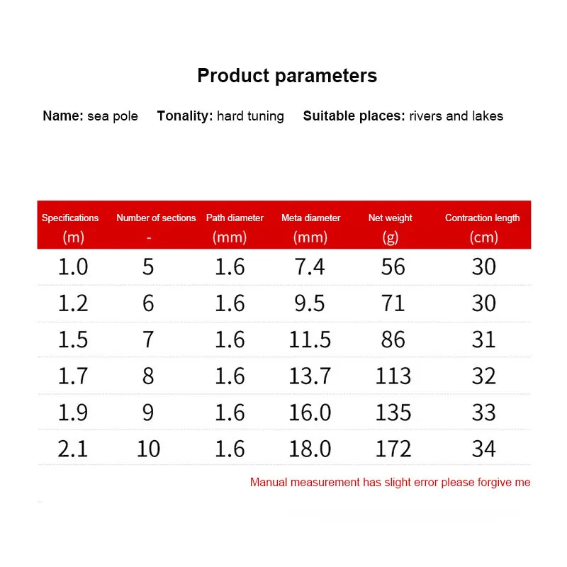 1.9 meters parameters: contraction length 35cm, first diameter 1.8mm, Yuan diameter 16.2mm, section number 9, net weight 141g