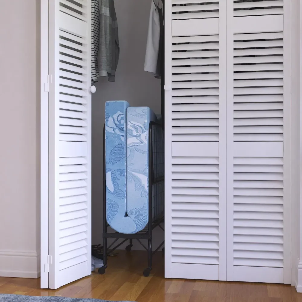 Foldaway sturdy twin size metal frame neatly folds up and tucks away in closets when not in use. Metal mesh base for added comfort and durability. Convenient space-saving design fits in almost any room size.