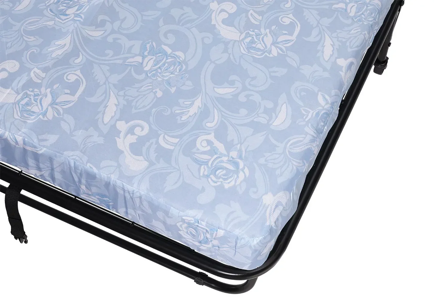 Rollaway bed with 100% thermobonded high density polyester filled 5" mattress with floral cover design. 100% polyester cover. Cot mattress firmness level: medium support.