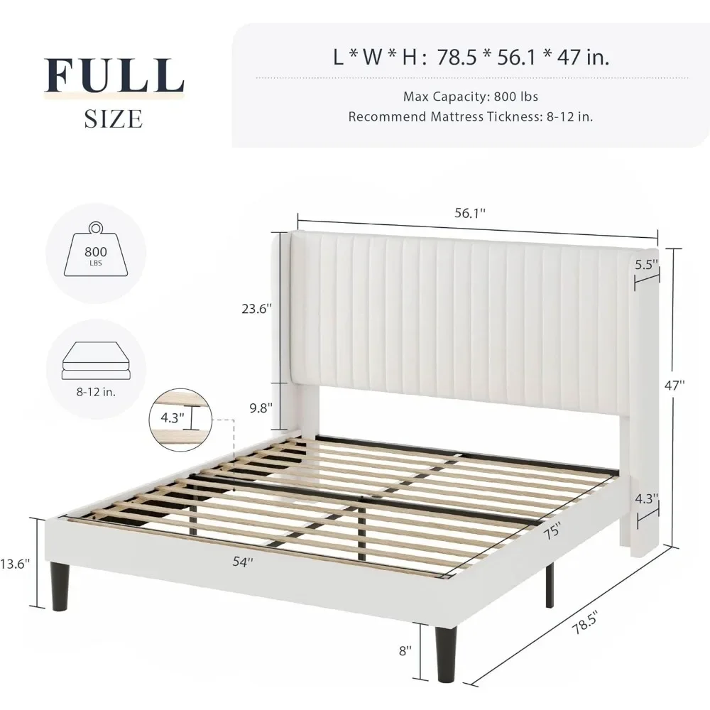 Full Size Velvet Bed Frame, Padded Platform Bed、Sturdy Wooden Slats、No Springs Required、Easy To Assemble、White