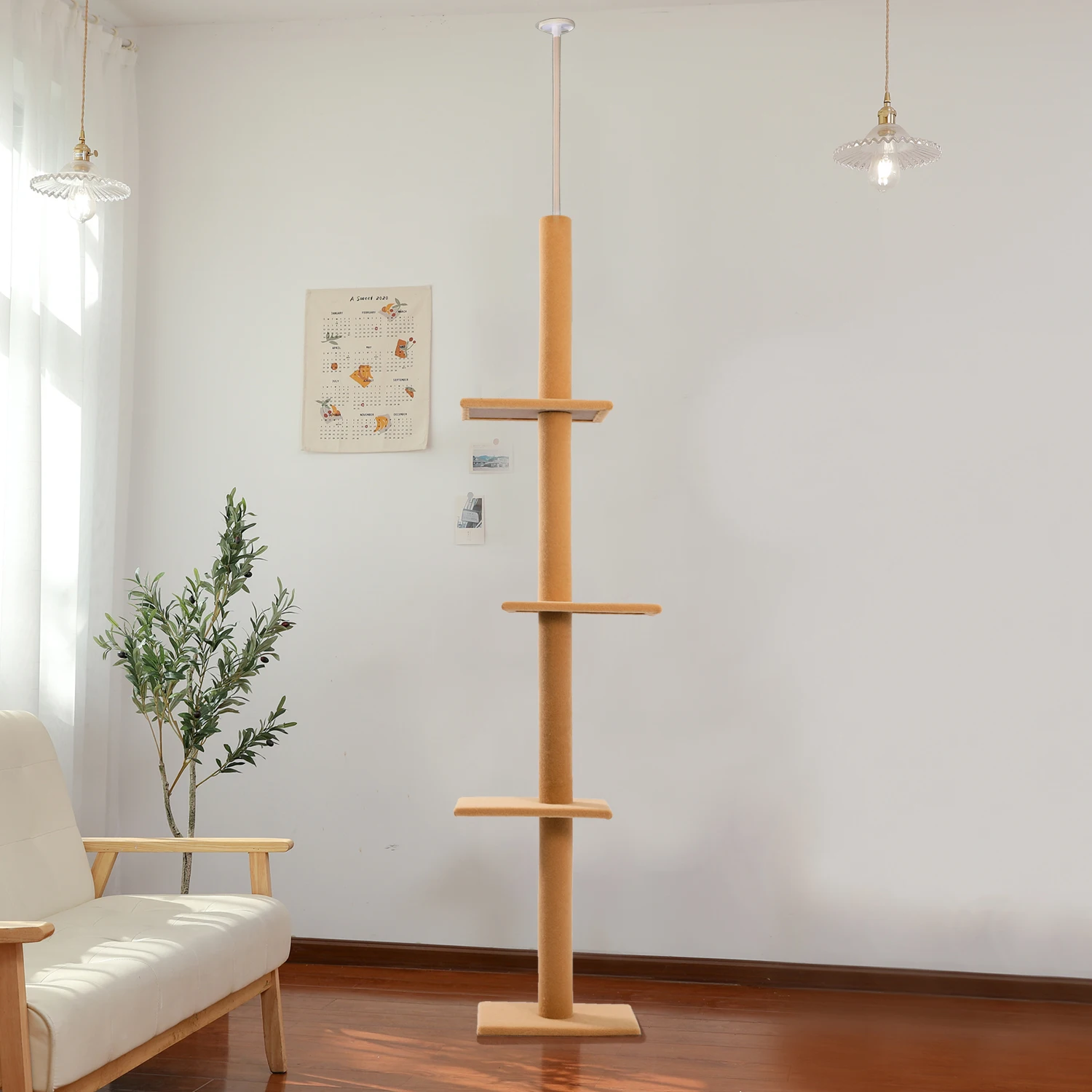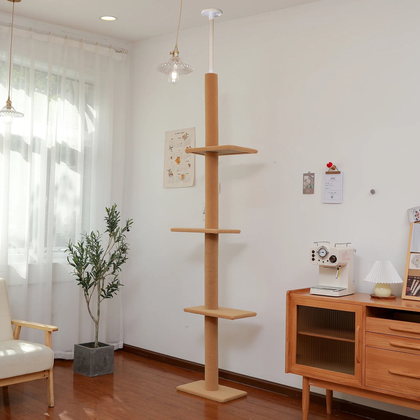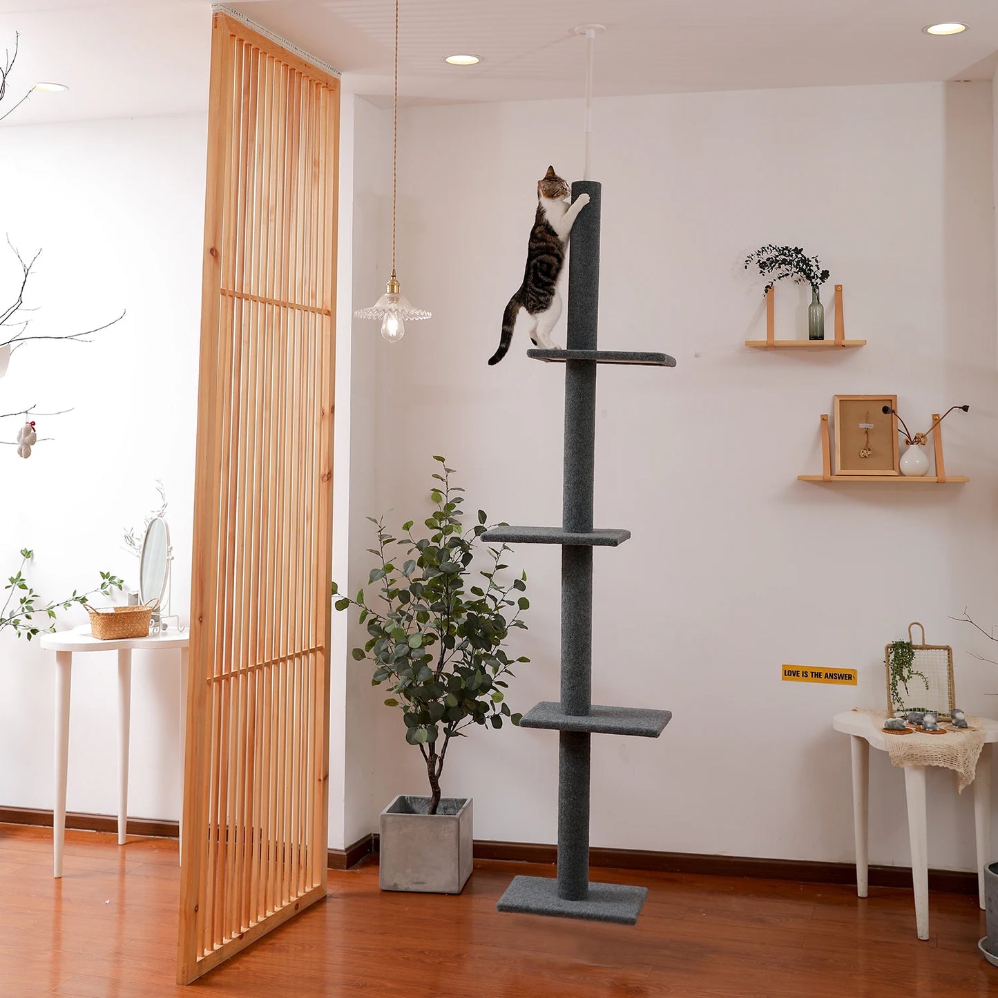 1.Cat Tree with Adjustable Height: The whole cat tree consists of 5 levels push-covered platforms, the tension rod on the top can be adjusted to a preferred height from high to low accommodate room ceiling. Don't fret about your feline being up so high because this cat tree has an adjustable spring at the top, which keeps it stable between your floors and ceiling, for a tip-free, stable environment.