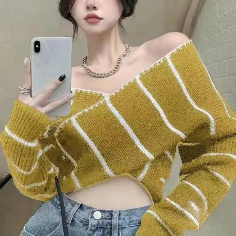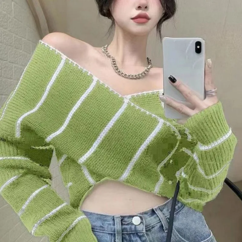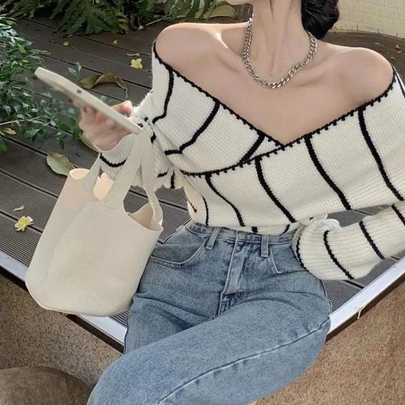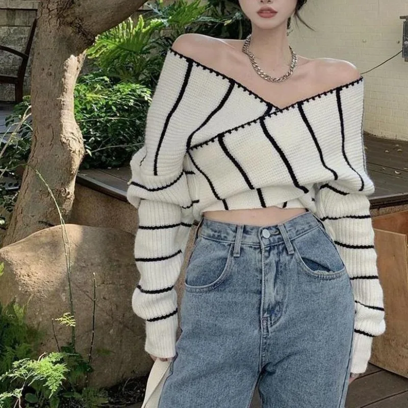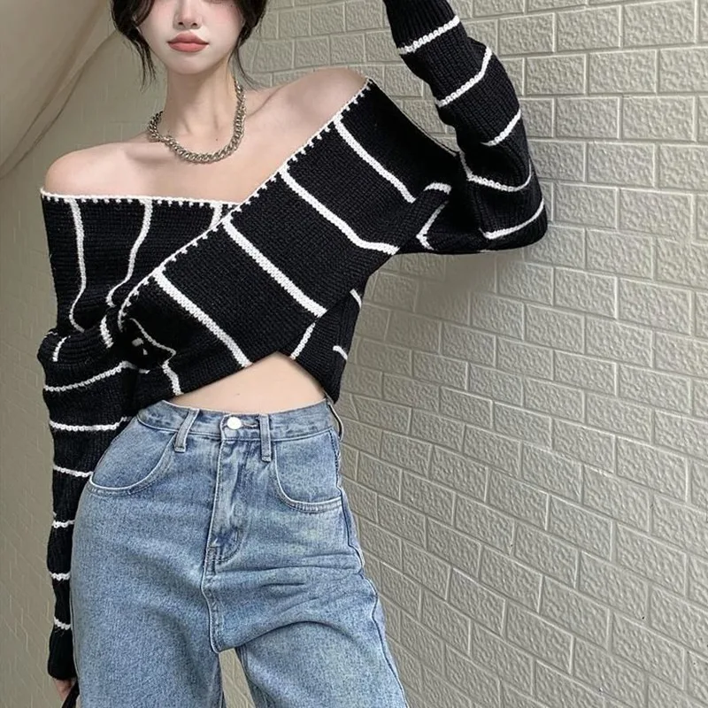 Spring Autumn Fashion Korean Style Casual Simple All-Match Sexy Sweet Retro Knitted Striped Cross One-Shoulder Design Short Style V-Neck Long-Sleeved Top