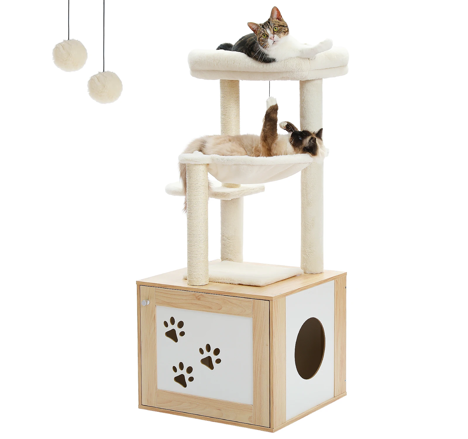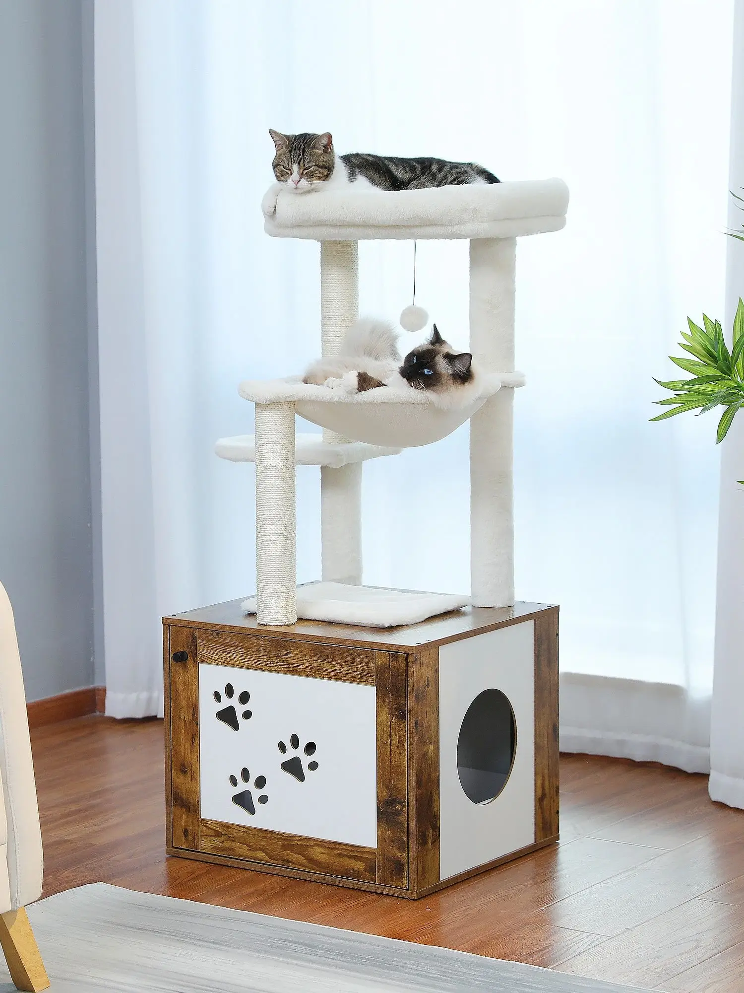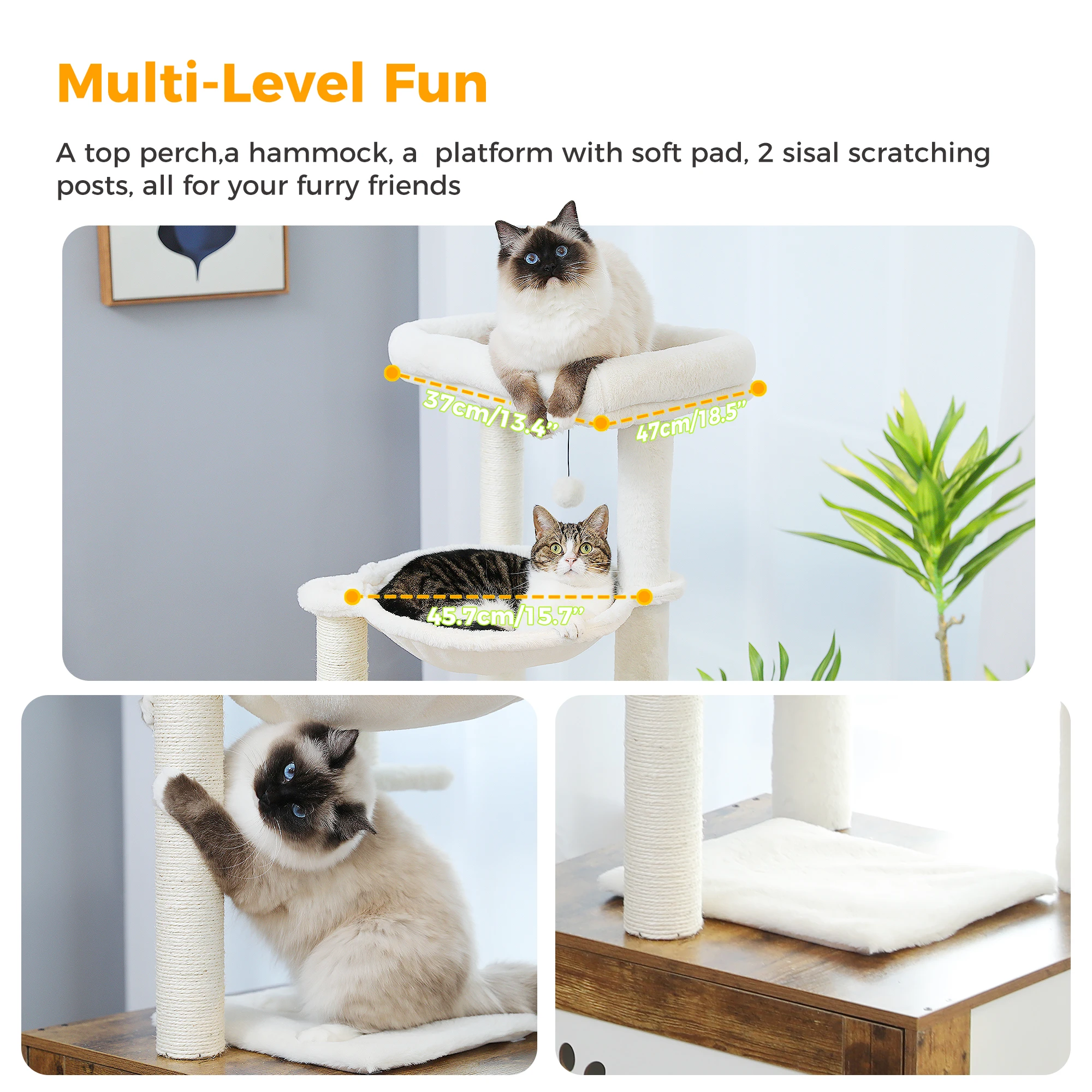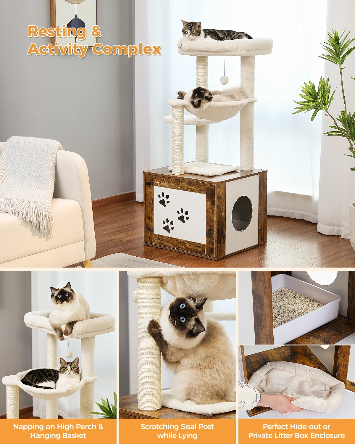 Sturdy Structure & Multifunction: A large litter box enlosure offer cat a private space to poop and also work as the base of this cat tree, the cat tower become quite sturdy and solid. Large hammock and top perch offer cats luxury quality sleep, 3 sisal covered scratching posts are equipped for cats to sharpen nails, cats' need are satisfied on this all-in-one cat tree.