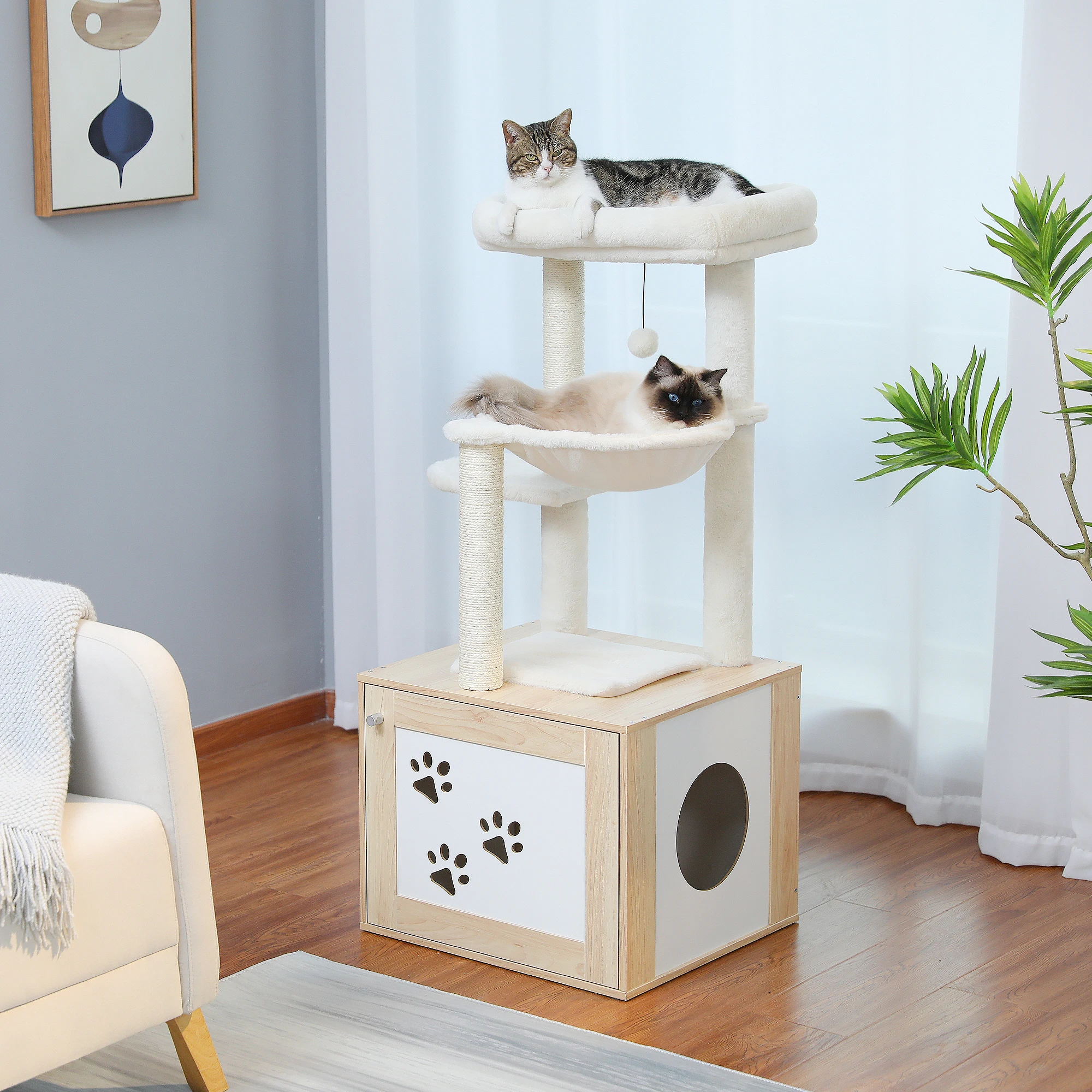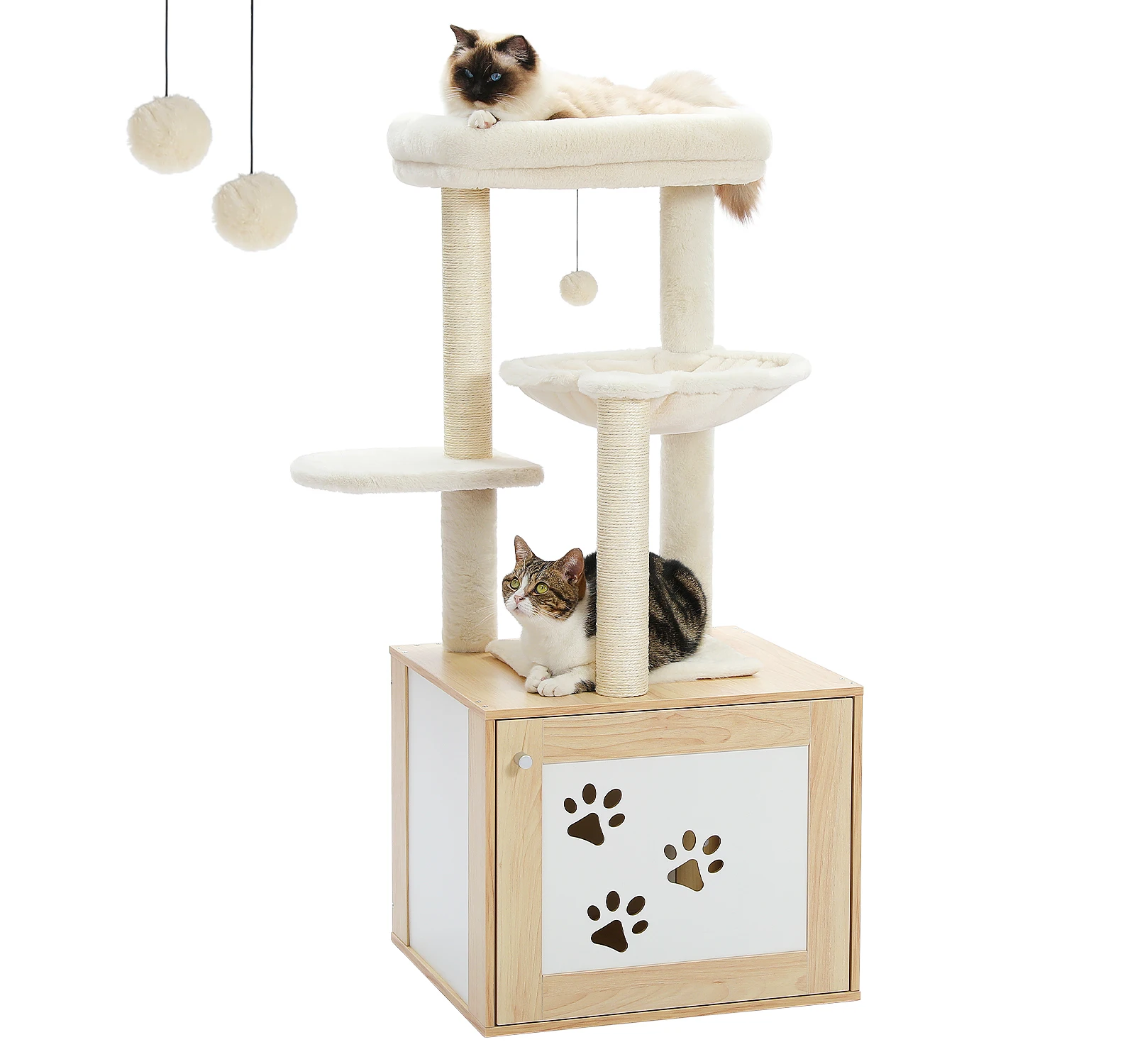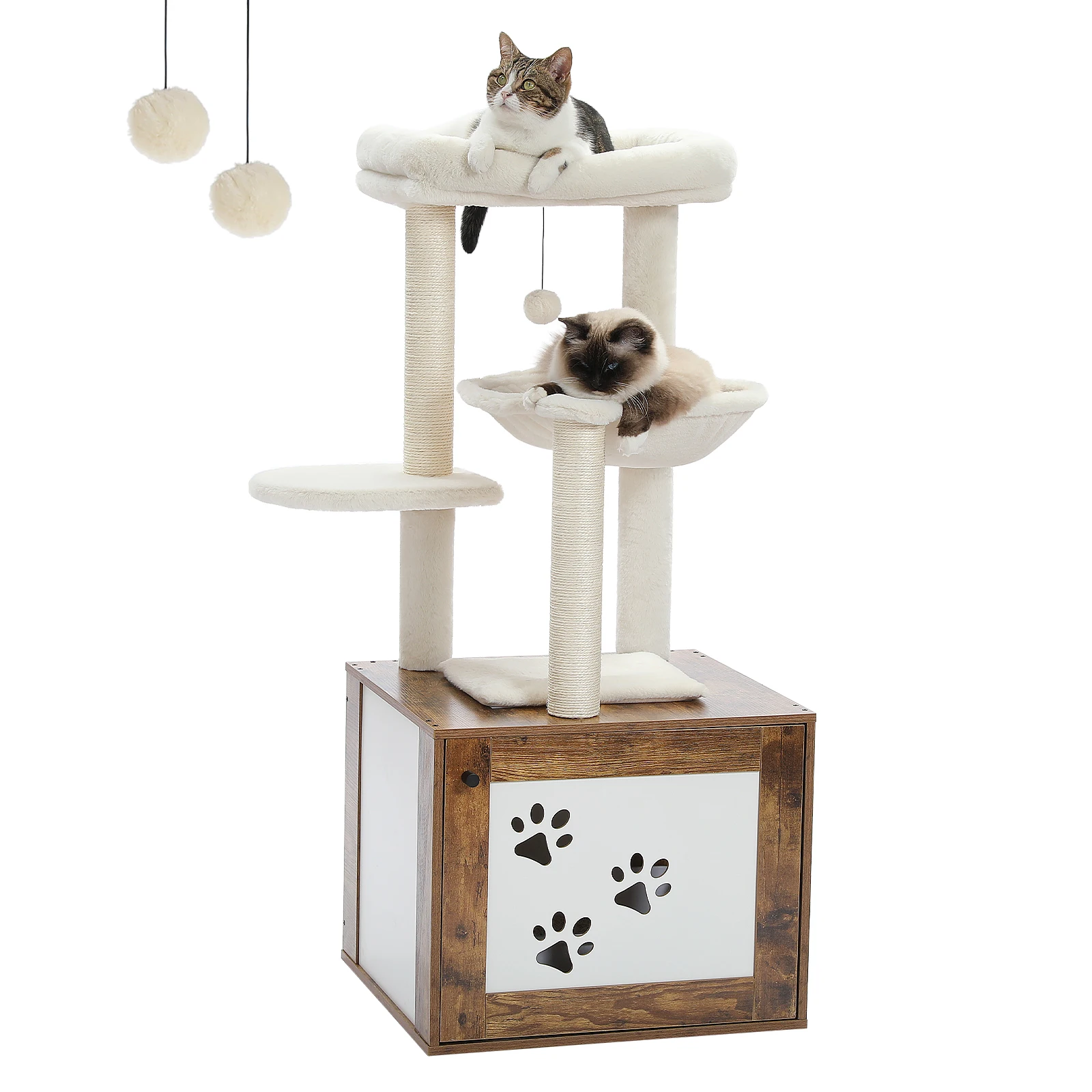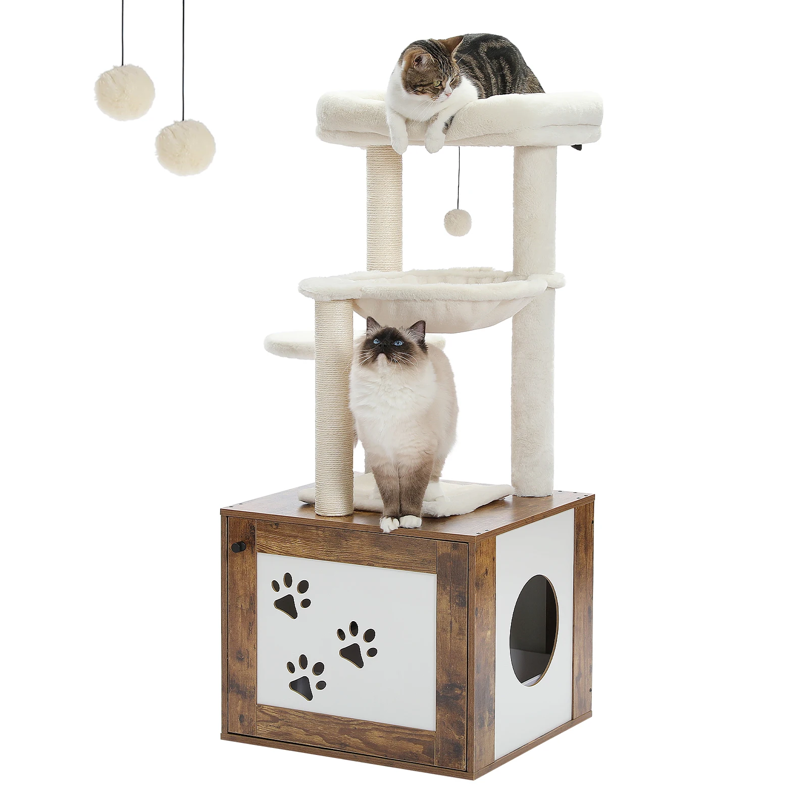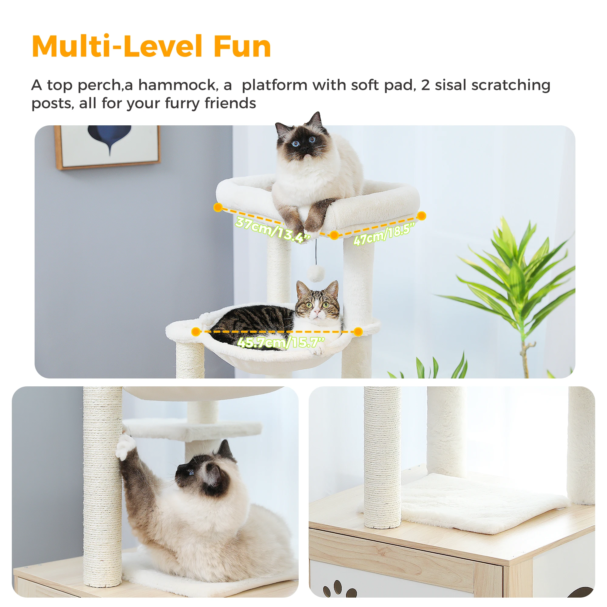 Sturdy Structure & Multifunction: A large litter box enlosure offer cat a private space to poop and also work as the base of this cat tree, the cat tower become quite sturdy and solid. Large hammock and top perch offer cats luxury quality sleep, 3 sisal covered scratching posts are equipped for cats to sharpen nails, cats' need are satisfied on this all-in-one cat tree.