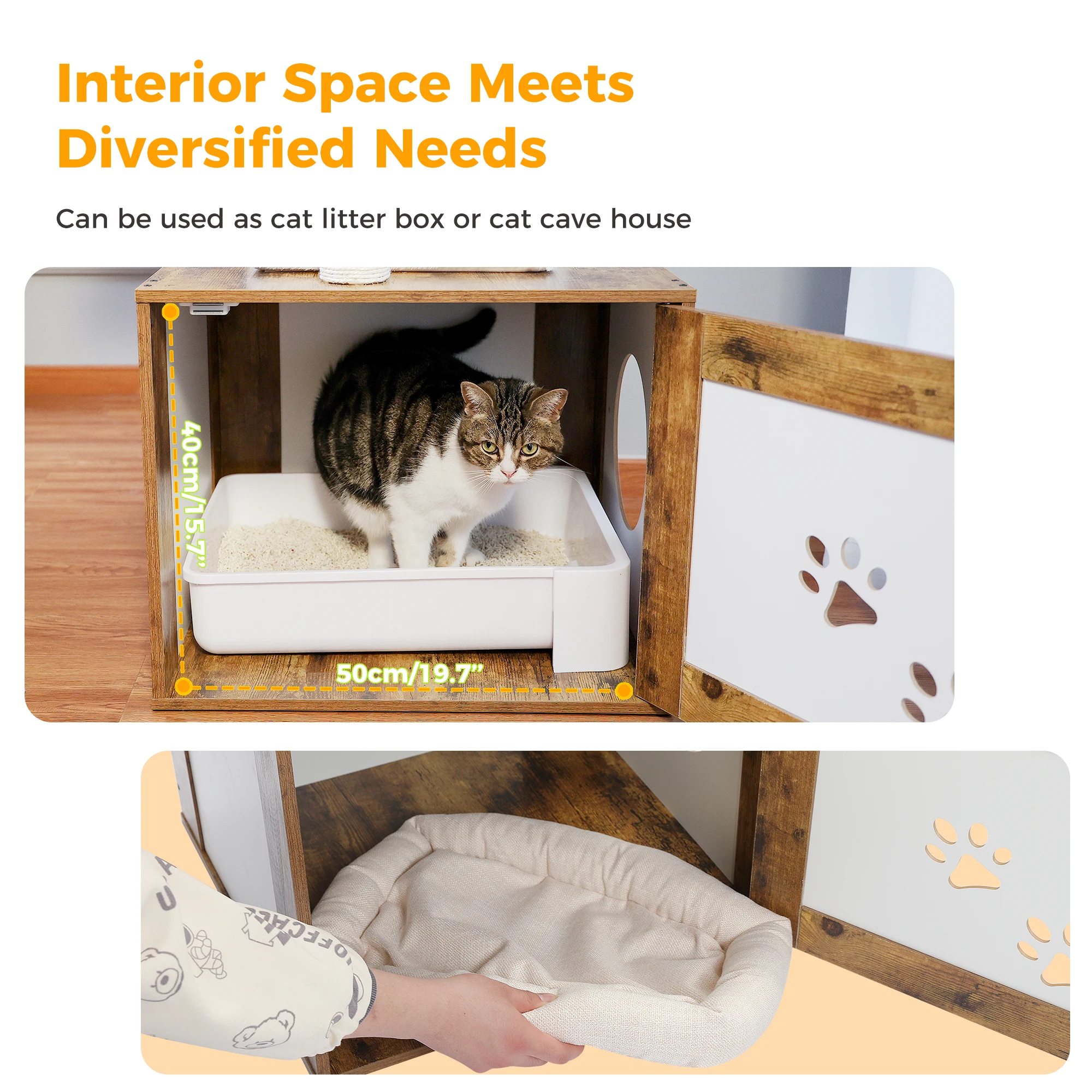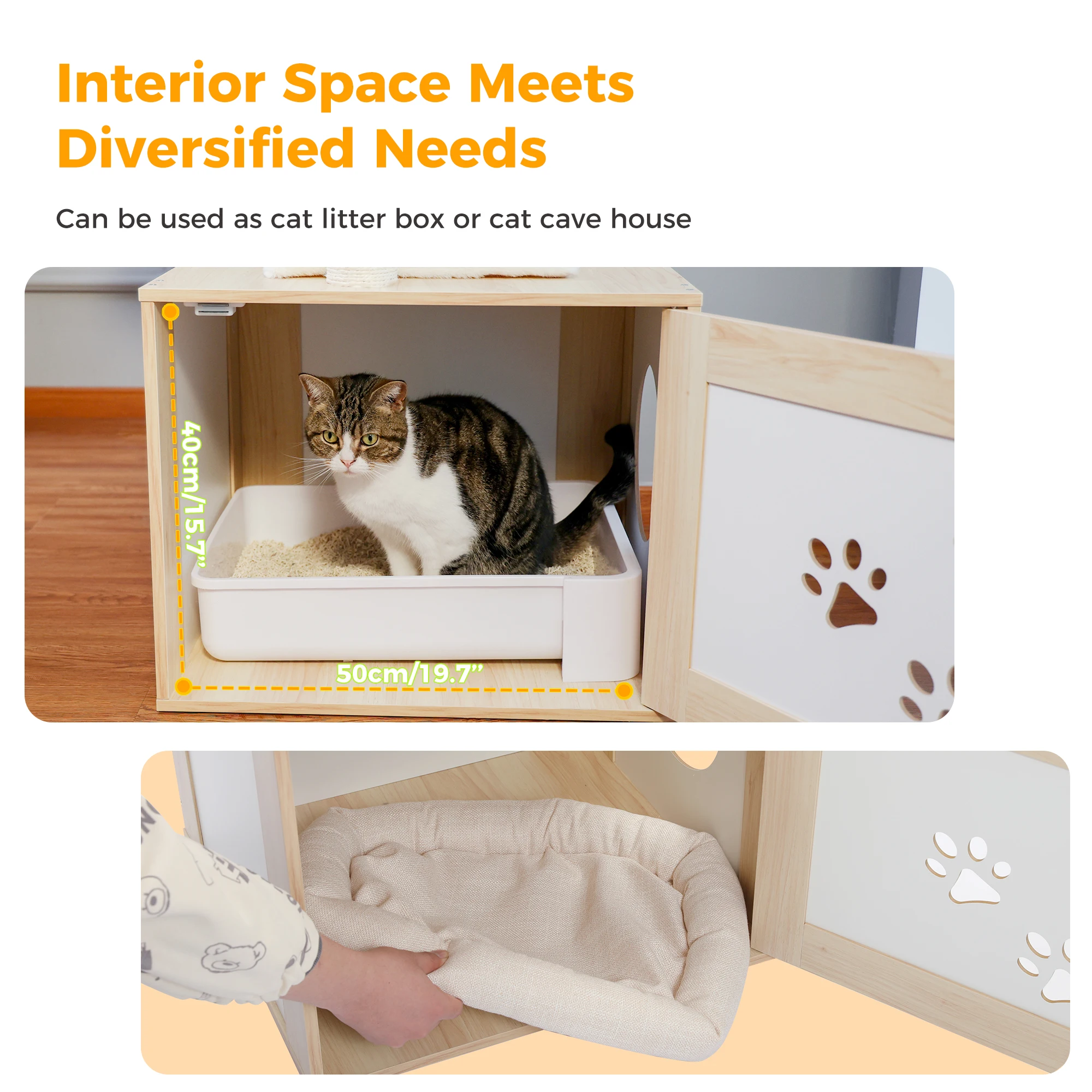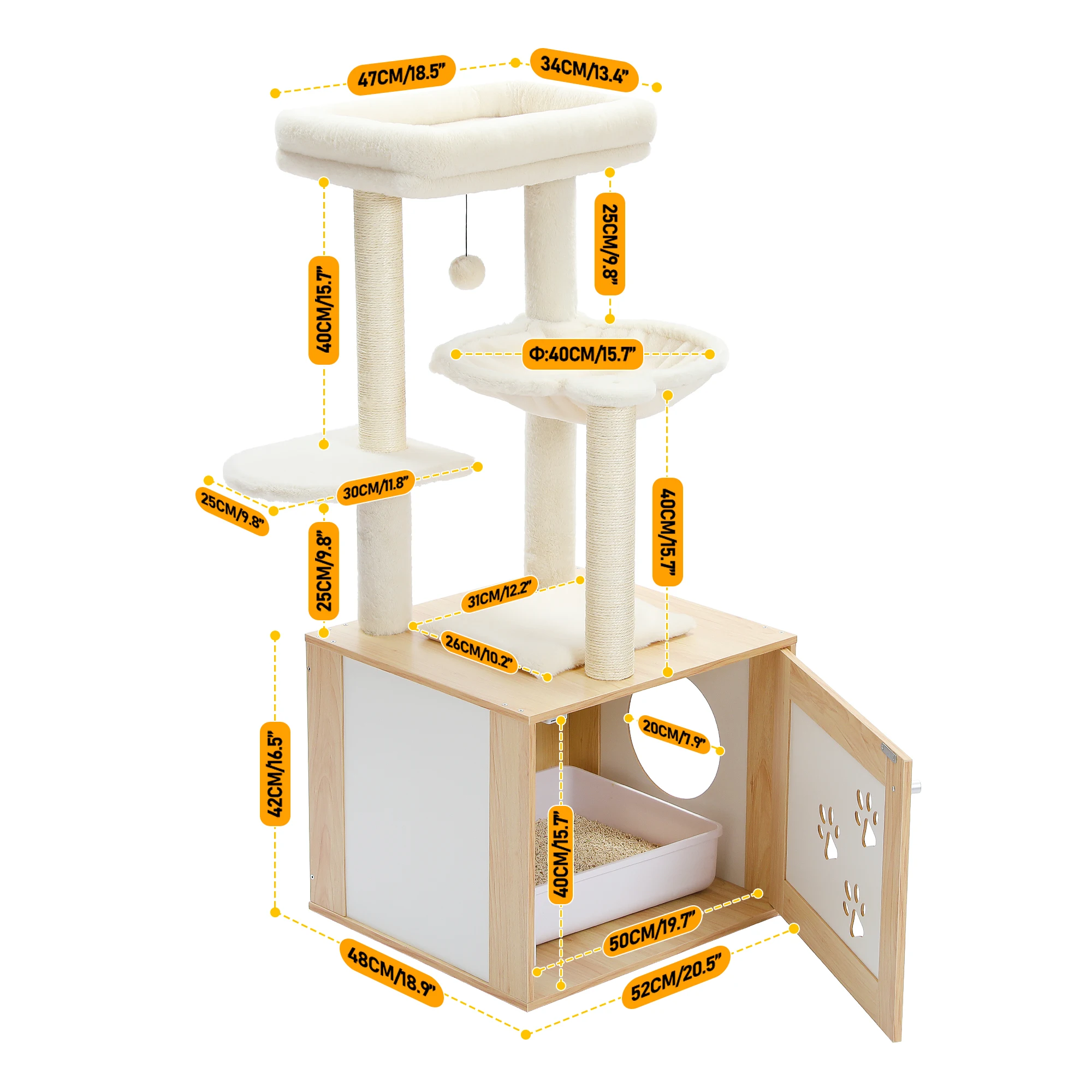 Enclosure for Standard Litter Box: This cat tree furniture contains a litter box enclosure, which can be a storage cabinet as well, size of 52cm*48cm*117cm,can hold most standard cat litter box, or put cat food, cat toys instead. While being used a a litter box enclosure, the cat cabinet can keep out the litter odor, you can breath a fresh air until the time to shovel cat litter.
