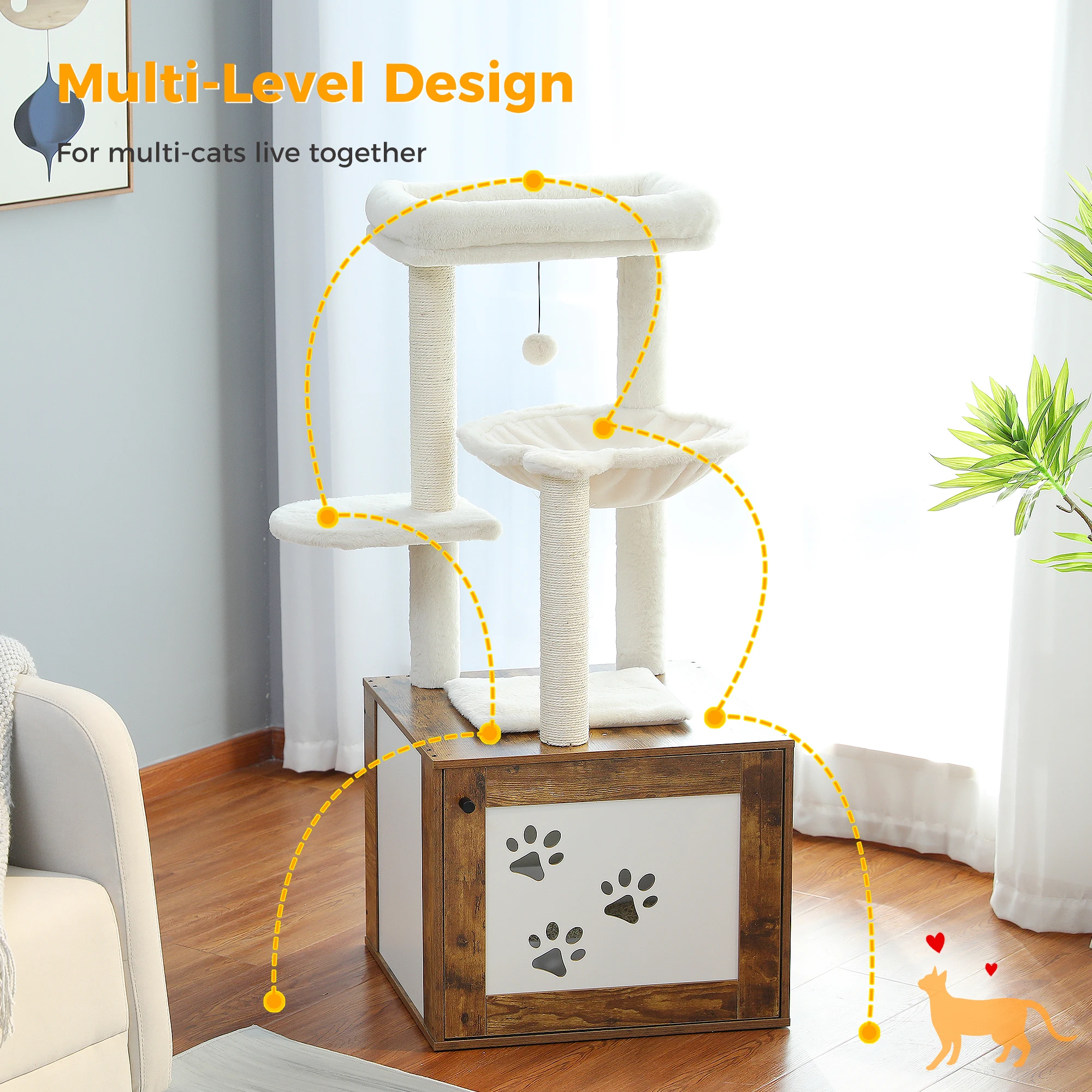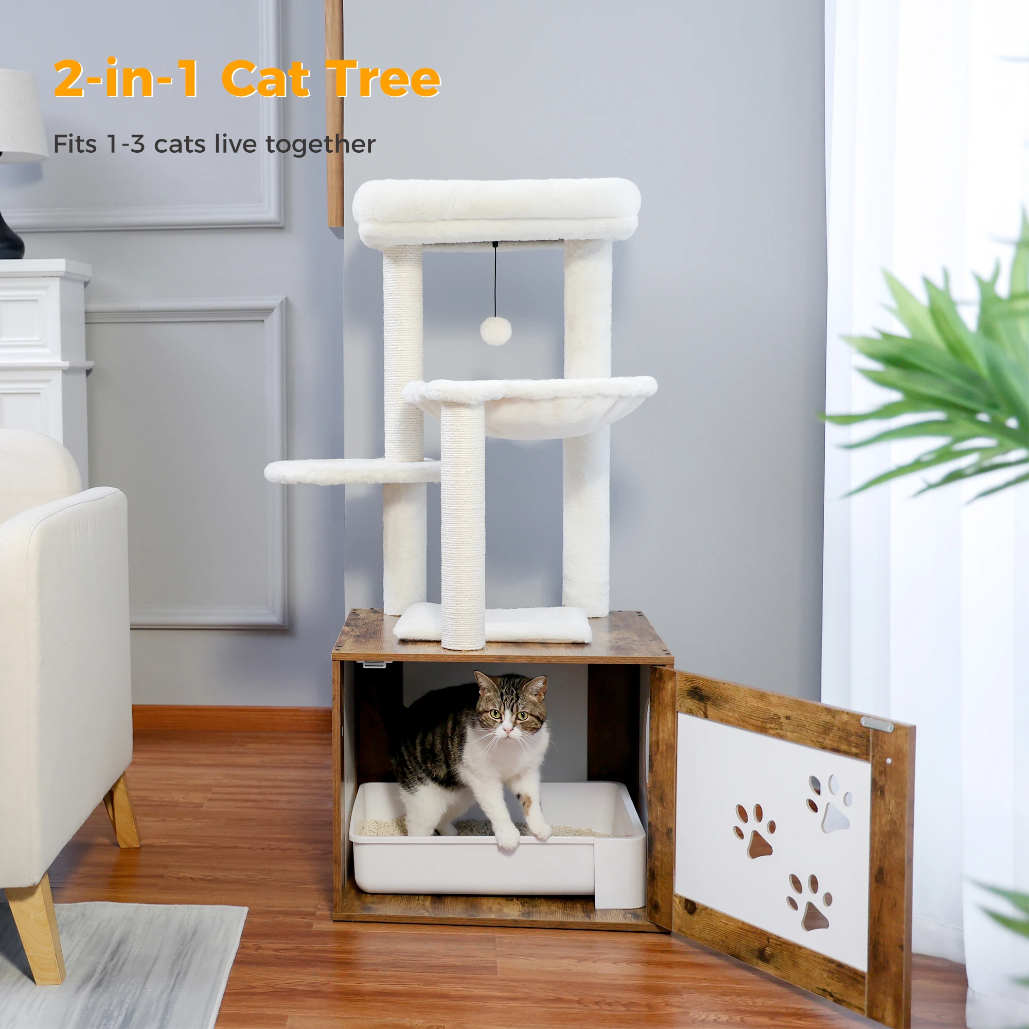 Large Cat Tree with Litter Box Enclosure, 117cm Rustic Brown, Spacious Perches & Hammock, Sturdy Structure, Multifunctional