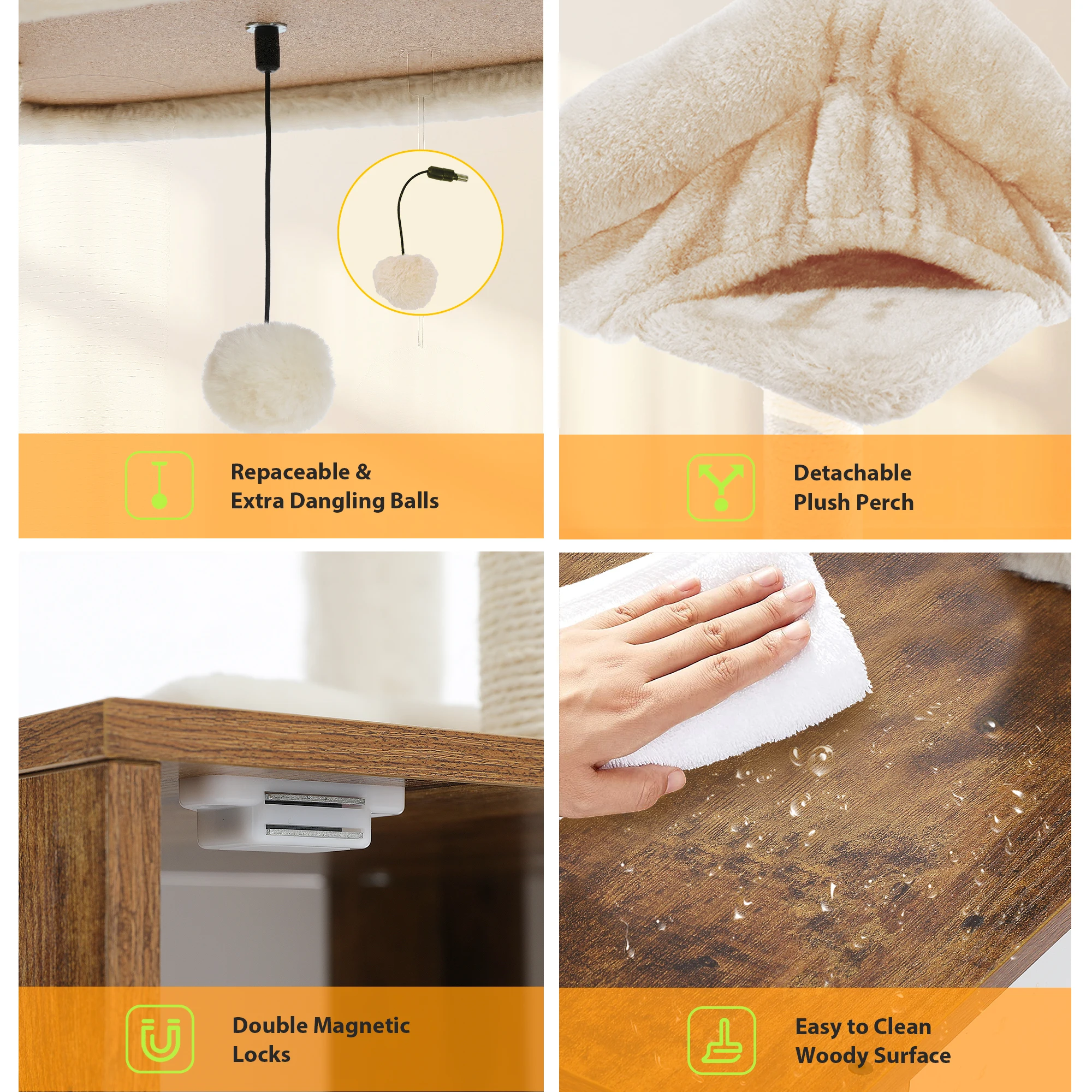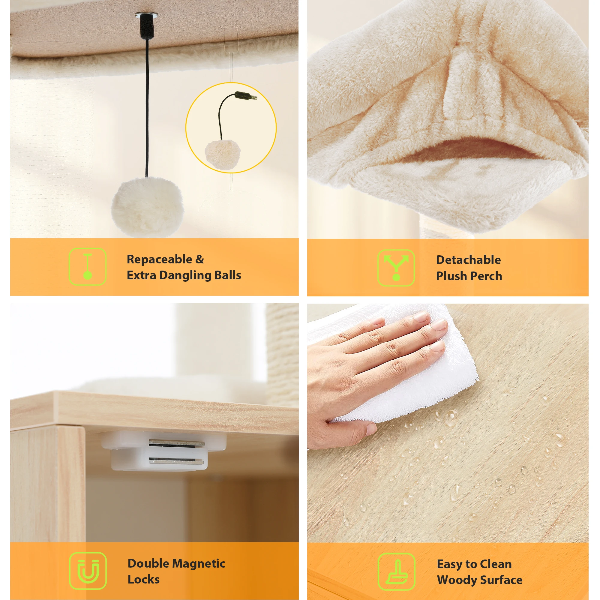Elegant Cat House: Door of this cat tree with litter box enclosure is shaped 3 cute cat claws, which allows you to interact with your cat. One-way exit is design higher to stop the cat litter while being dug. And cats can play with dangling ball, a replacement ball is included in package, don't worry about cats destroying their cat toy.