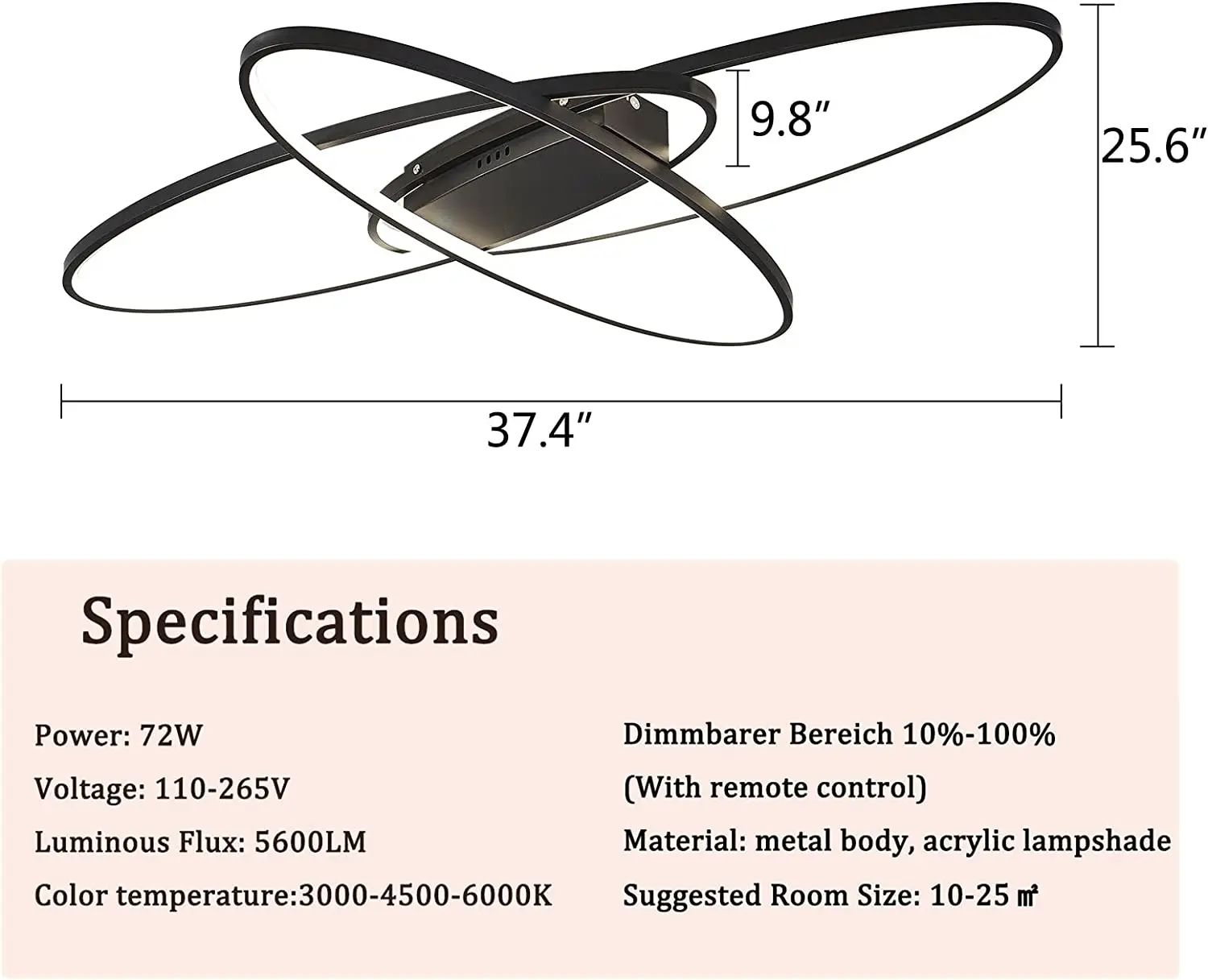 【Geometric & creative design】: The ceiling lamp is attached to a cuboid base on the ceiling and consists of three staggered, long ellipses that overlap and run parallel to each other, which ensures that a large area is illuminated.