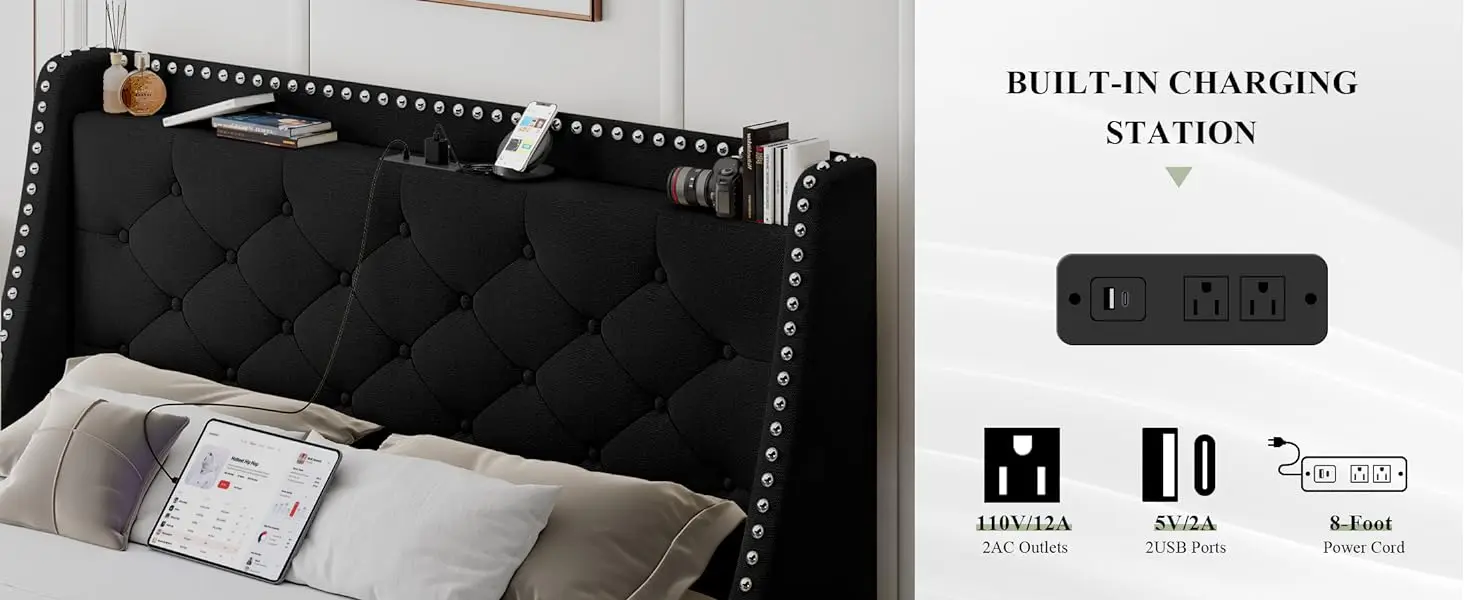 - Storage Headboard with Charging Station: Built-in 2 AC outlets and 2 USB ports, let you charge within your reach. Besides, the top of the headboard leaves 4" storage space, making it convenient for you to place commonly used items, such as books, phones, cameras, etc