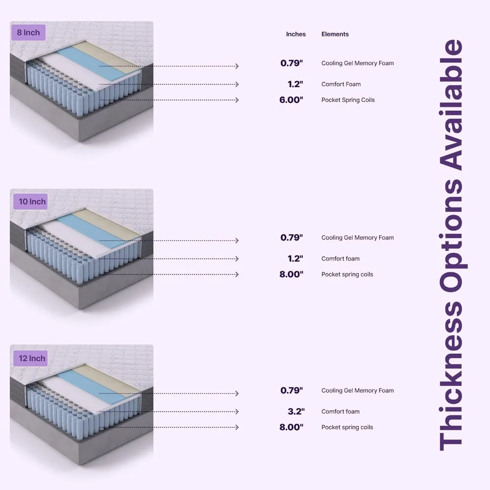 - Hybrid Cooling Gel Infusion: Experience the revolutionary comfort of our Hybrid Cooling Gel Infused Pocket Spring and Memory Foam Mattress, perfect for all sizes, including twin, twin XL, full, queen, and king mattresses.