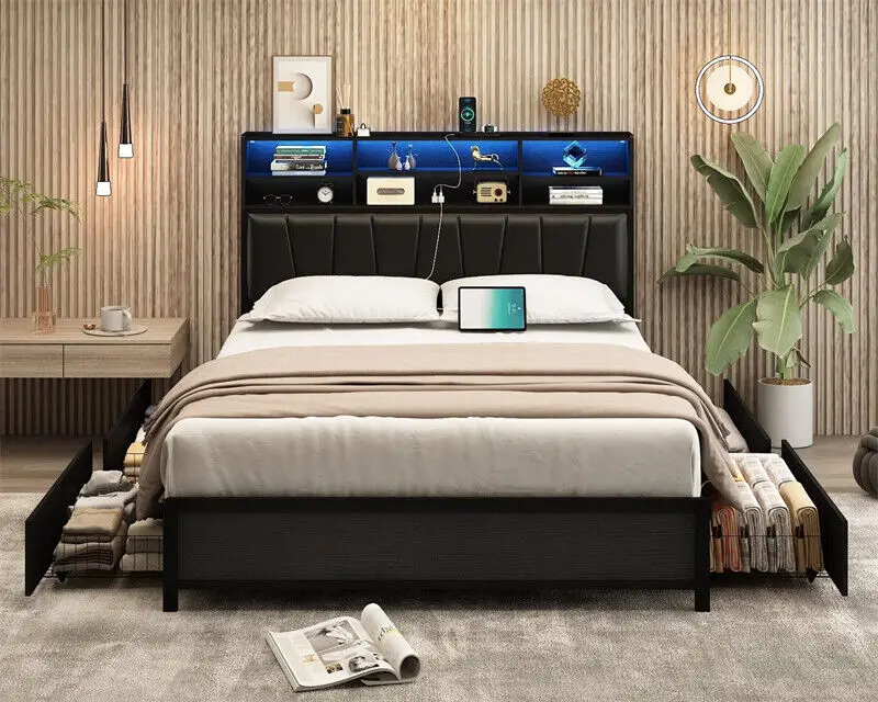 Queen/Full Size Bed Frame Platform Bed, adult and adolescent double beds with LED lights and drawers, single beds, modern beds