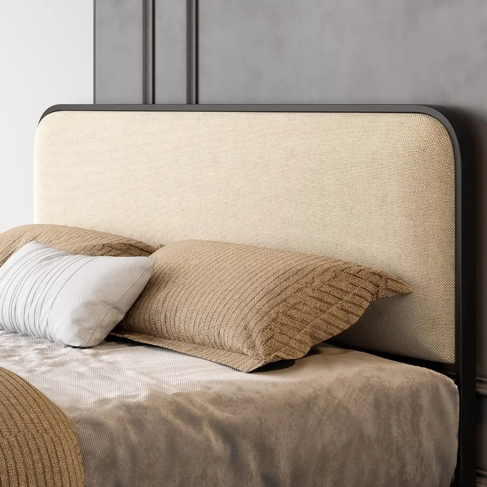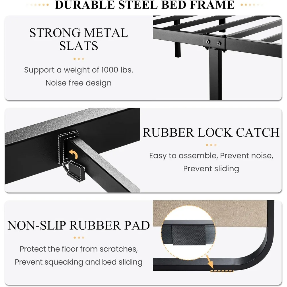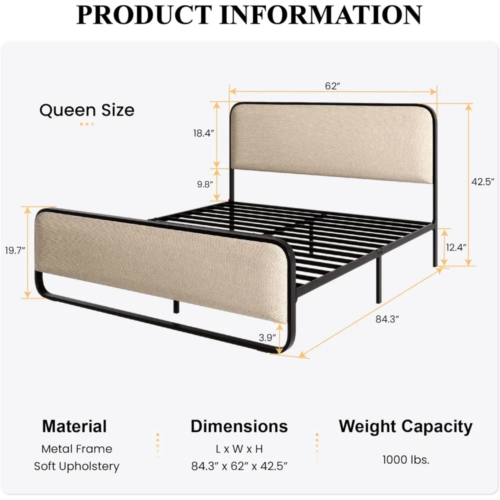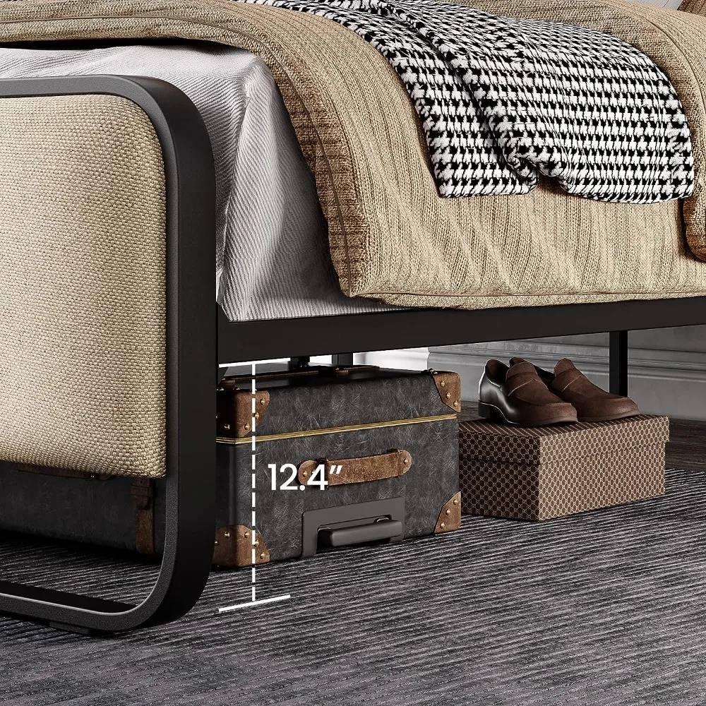 Queen platform metal bed frame, Curved upholstered headboard and footboard, Large under bed storage space, Beige