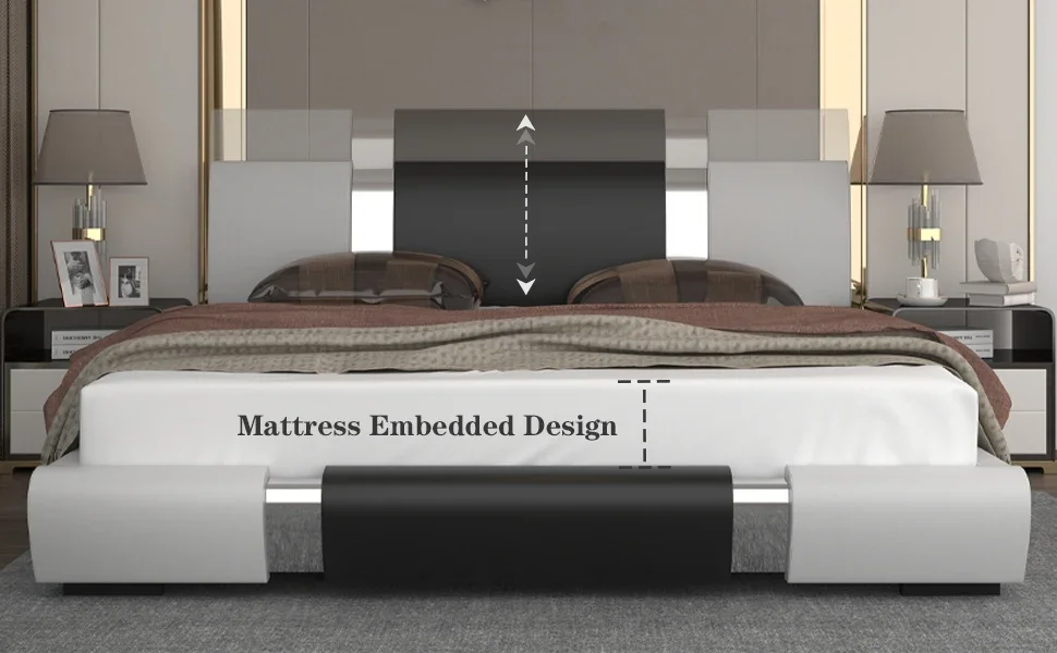 queen size bed frame, With faux leather upholstered headboard and wood slat support, Heavy duty mattress base,White & Black