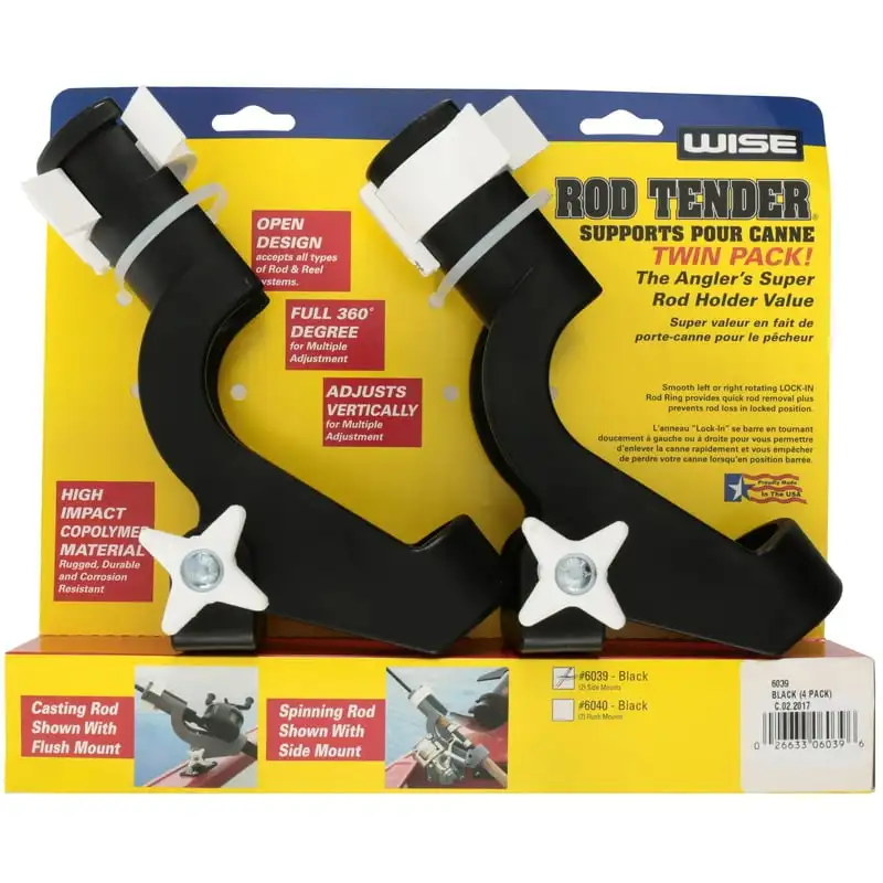 Rod Tenders are constructed from a high-impact injection molded co-polymer plastic with a black . They offer multiple settings for optimal positioning with a sliding ring that allows quick rod insertion and removal. They accommodate both spinning and casting reels. 6039 Rod Tender Rod Holder Side Mount - 2 Pack