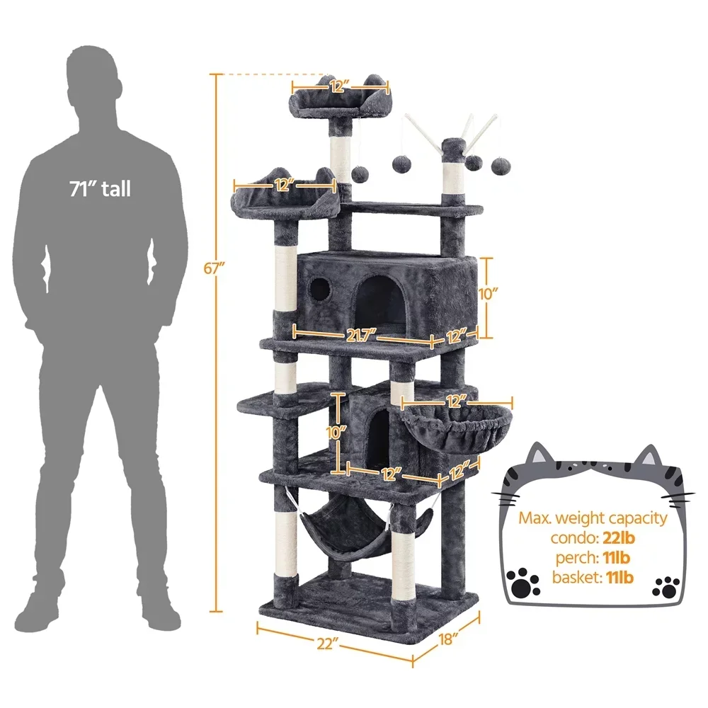 SMILE MART 67" H Multi-Level Cat Tree Tower with 2 Cat Condos & Hammock Basket, Dark Gray