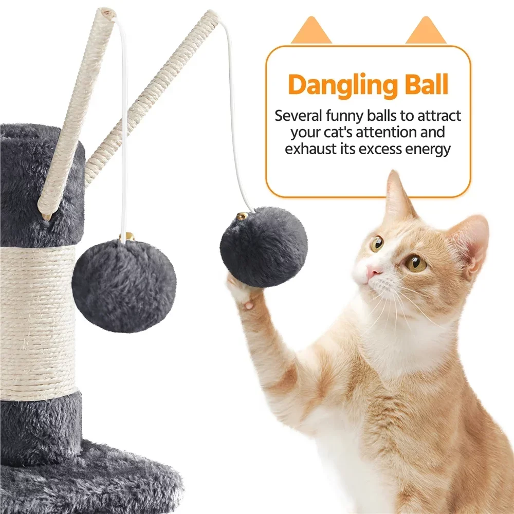 Do you know about your cat? What is your cat's interest? Cats are active and lively. They need suitable places and leisure facilities to have fun. Our multifunctional cat tree will meet your needs. This multi-level cat tower is loved for its spacious cat cave, exciting fur balls, and comfortable top perch and hammock for relaxing after a long day of hide-and-seek. These two large cat condos have everything your cats and their cat friends need for long-lasting fun and relaxation day after day. Selected materials include CARB P2-compliant particleboard, soft plush covering and durable sisal ropes. This whole cat tower is comfy, attractive, and practical, ensuring a long service life.