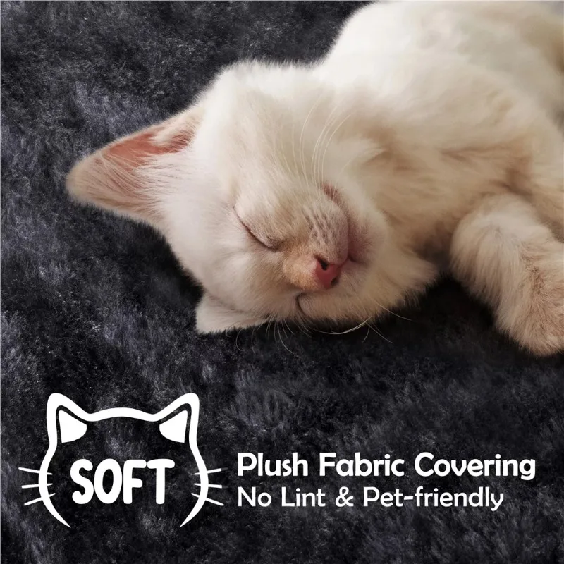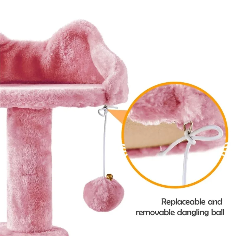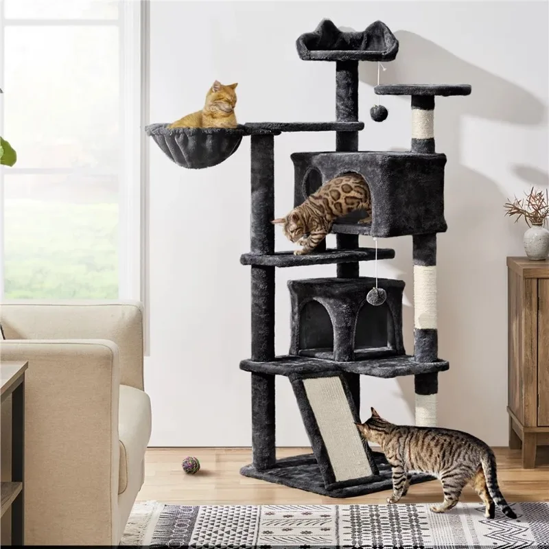 This 6-level cat tree is designed for more than one kitten and small or medium cats to play at the same time. It expands the activity area in the room vertically and meets the climbing nature of kittens. Two fur balls are included for the kittens to play with and two fluffy condos offer super soft and warm lounging spots. This cat tree tower is crafted of safe and environment-friendly materials. The non-toxic particle board is covered with upgraded soft and skin-friendly plush, and posts are coiled with natural sisal. A safety wall strap is provided to attach the cat tree to the wall to secure your feline friends every leap. There is a big baseboard to avoid wobbling or tipping over and ensure stability. Three sisal rope coiled posts at different heights help encourage positive.