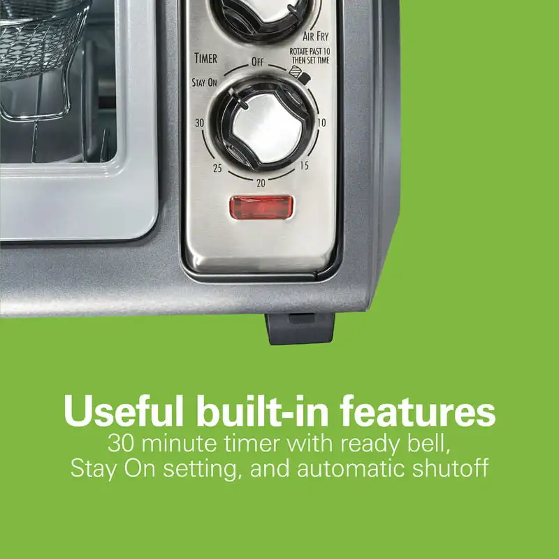 The ® Easy Reach® Sure-Crisp® Air Fryer Toaster Oven in Stainless Steel combines the convenience of our popular Easy Reach Toaster Oven with Sure-Crisp air frying functionality. You get the countertop cooking convenience you love in a toaster oven, plus the even crisping and browning of an air fryer. You can toast, bake, broil and air fry right on your countertop. Using little to oil, our Sure-Crisp technology evenly cooks, browns and crisps all kinds of foods: fries, chicken wings, steaks, fish, vegetables, and more. The specially designed glass door makes it easy to add and remove foods from the oven, check foods as they`re cooking, and keeps the countertop free. There`s plenty of space too. This toaster oven fits 6 slices of toast, a 12" pizza, or a 9" x 11" baking pan. With 1400 watts of cooking power and 2 rack positions, the oven accommodates a variety of foods. It includes all the accessories you need to bake, broil, toast, and air fry. You get a metal mesh basket, bake pan, broil rack, and slide-out crumb tray. Other convenient features include auto shutoff, 30-minute timer, ready bell, and Stay On setting.