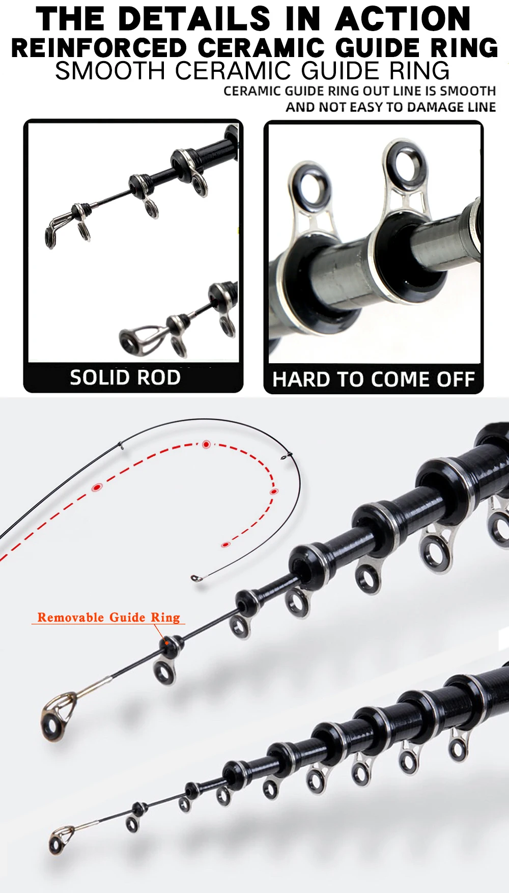 The ceramic guide ring is smooth and lightweight, which makes it easy to avoid lines becoming tangled or getting stuck. The guide ring is securely reinforced at multiple points, ensuring that it will not come loose easily. The heat dispersion is quick, and it's gentler on the fishing line, ensuring that it does not overheat or get damaged.