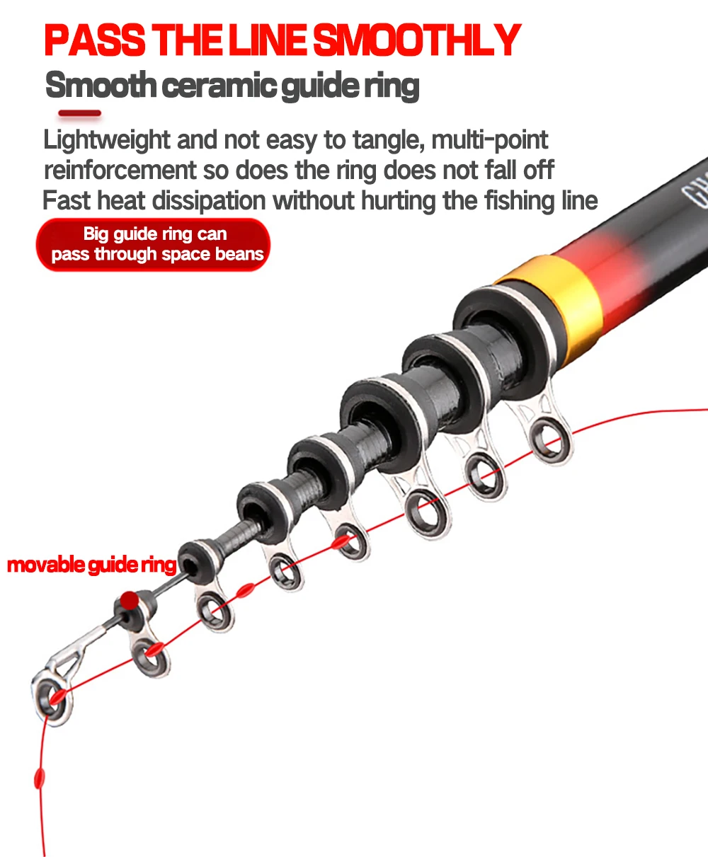 The large guide ring can pass through "space beans" and other ligatures to ensure that the fishing line is flexible and easily maneuverable. This fishing rod comes equipped with a mobile guide ring that smoothly rotates, preventing damage to the fishing line. Additionally, the guide protection cap ensures that the rod's guide ring isn't susceptible to injury or damage. Buy this fantastic fishing rod and experience the thrill of fishing like never before!