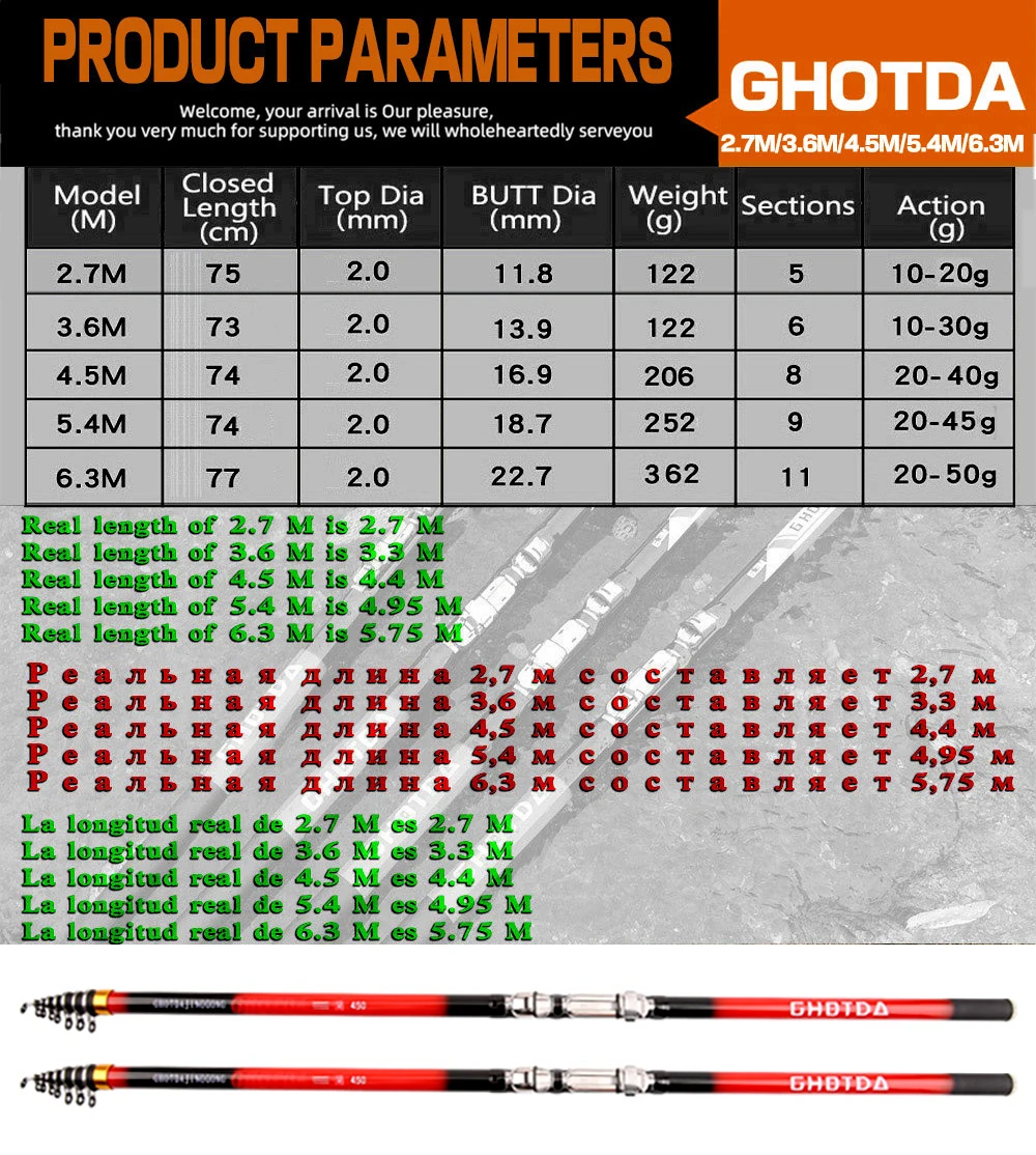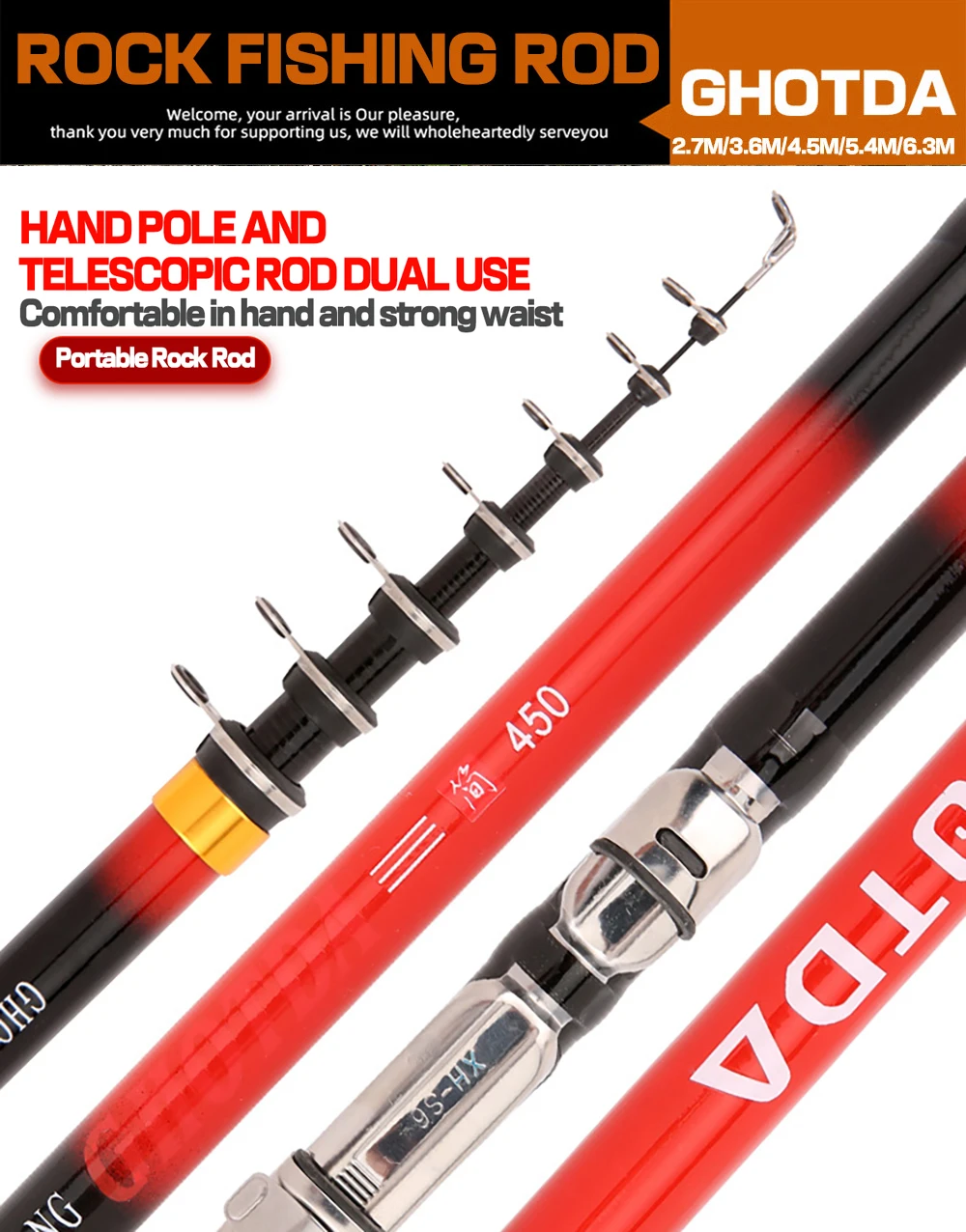 Introducing our top-quality Rock Fishing Rod made with premium carbon fiber, perfect for all your fishing adventures! With its telescopic spinning design, this fishing pole comes in a range of sizes - 2.7M, 3.6M, 4.5M, 5.4M, and 6.3M - making it ideal for use in various scenarios, including reservoir ponds, oceans, and rock fishing.