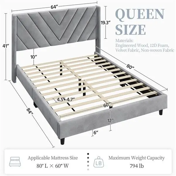 【Specifications】Color: Light Gray; Materials: Engineered Wood, 12D Foam, Velvet Fabric, Non-woven Fabric; Slat Quantity:12; Assembled Dimensions: 78.5″ L × 58.5″ W ×41.5 ″H; Ground Clearance: 6″; Maximum Weight Capacity: 750 lb.