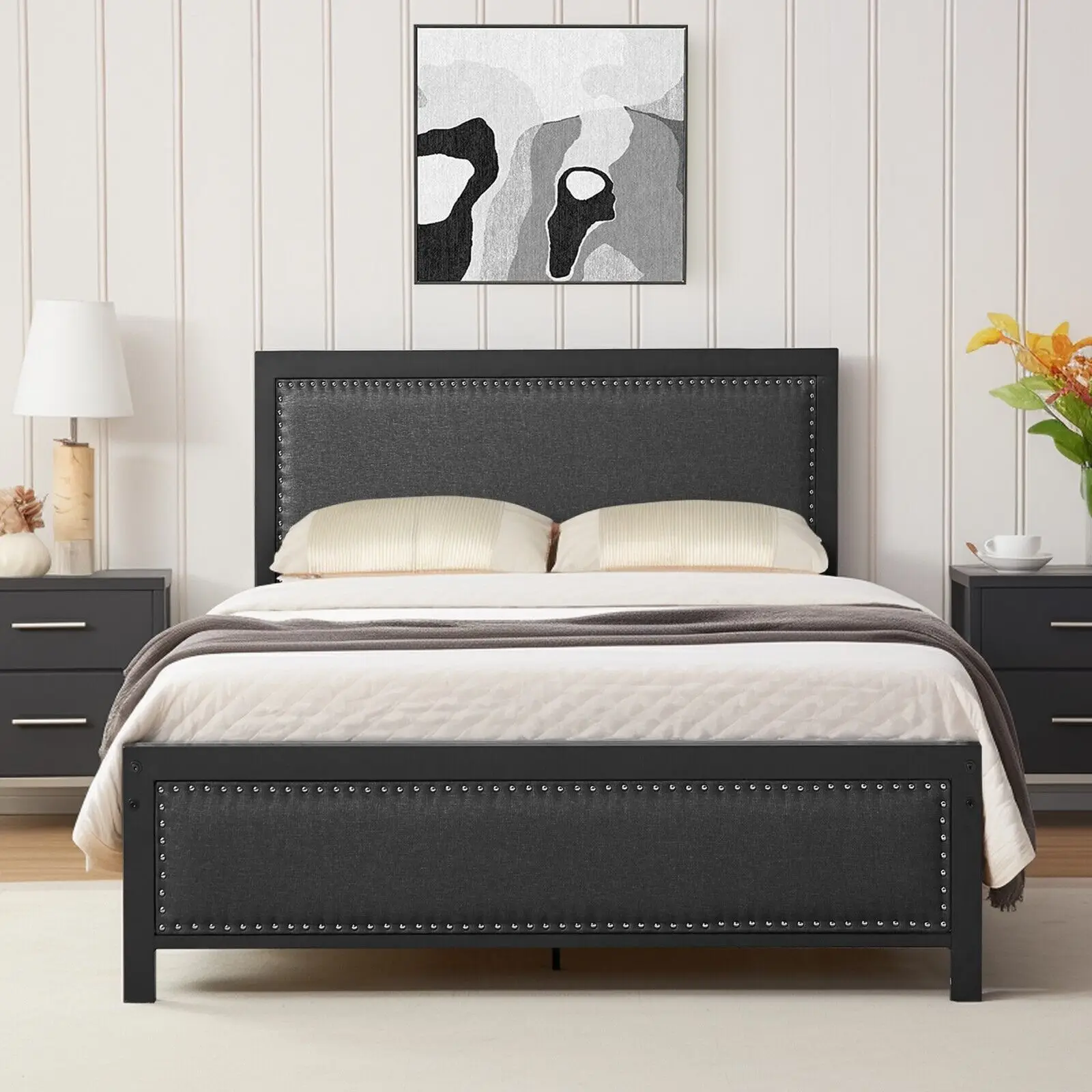Twin/Full/Queen Upholstered Bed Frame with Wooden Slat Support and Wing Side, Metal Platform w/Upholstered Headboard Footboard