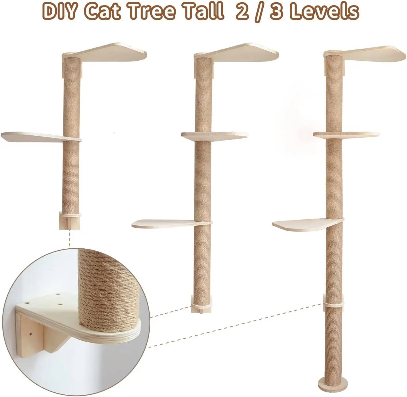Wood Cat Tower Floor to Ceiling Adjustable, Tree Tall Cat Scratching Post, Cat Tree with 3-Tier Floor for Climb