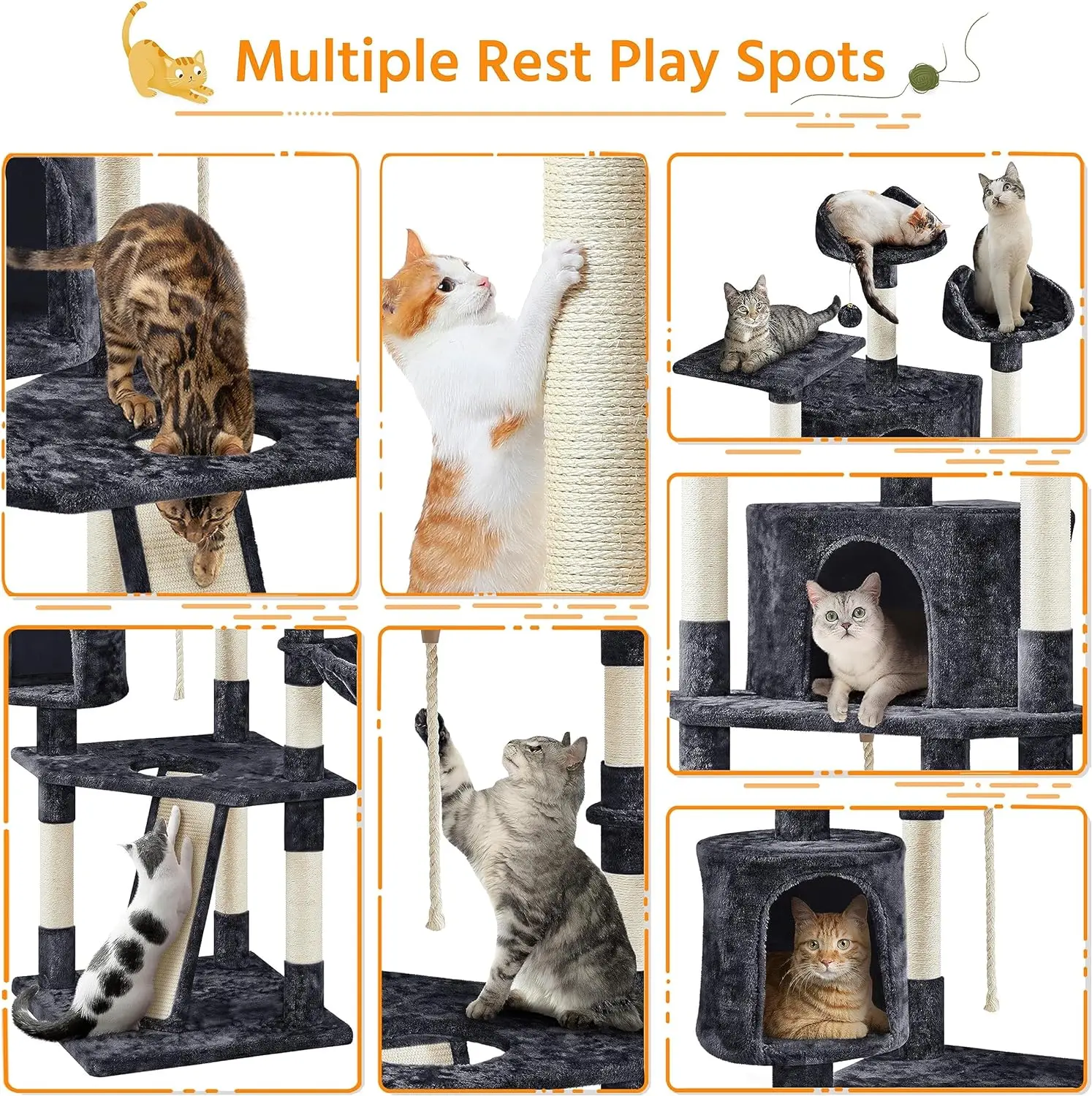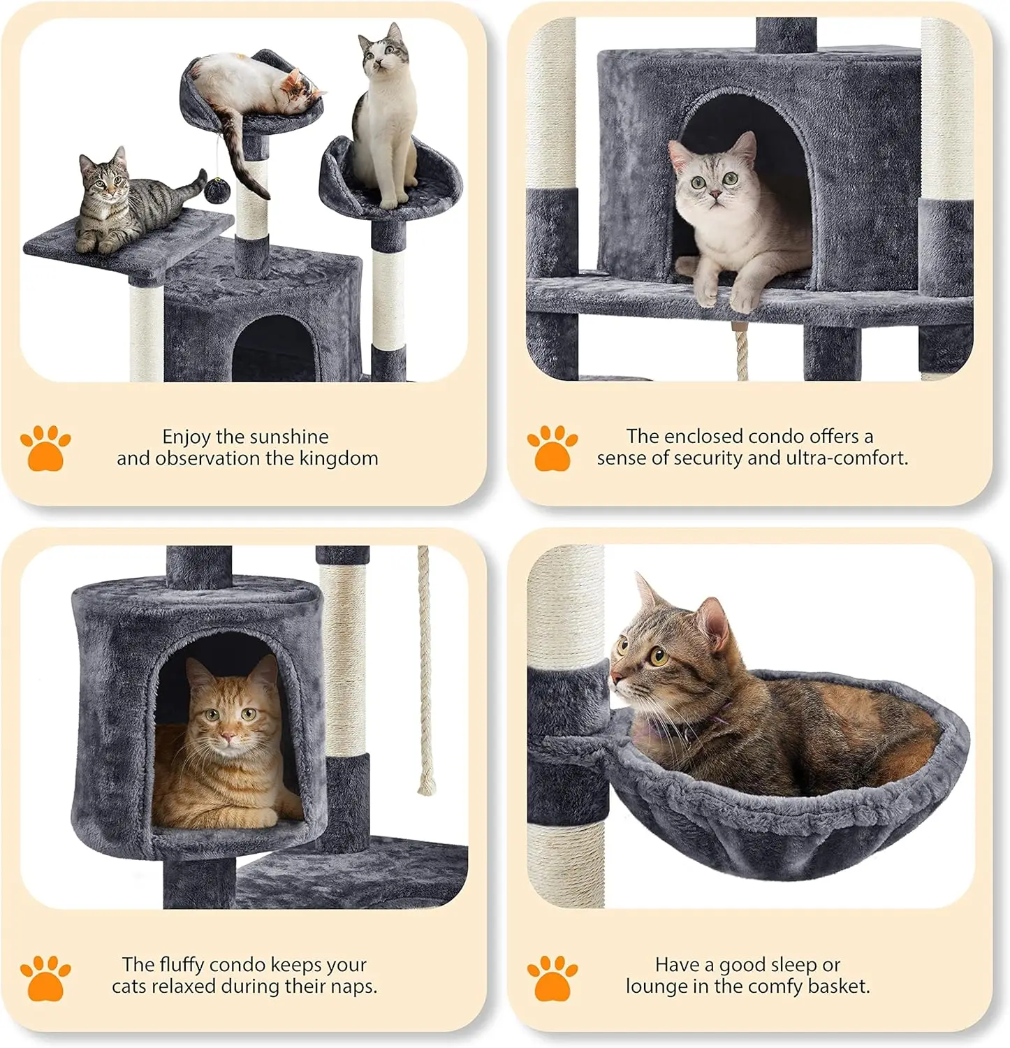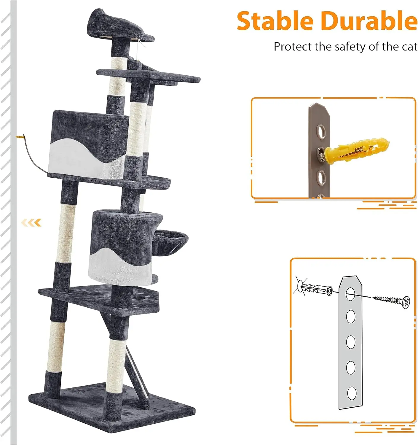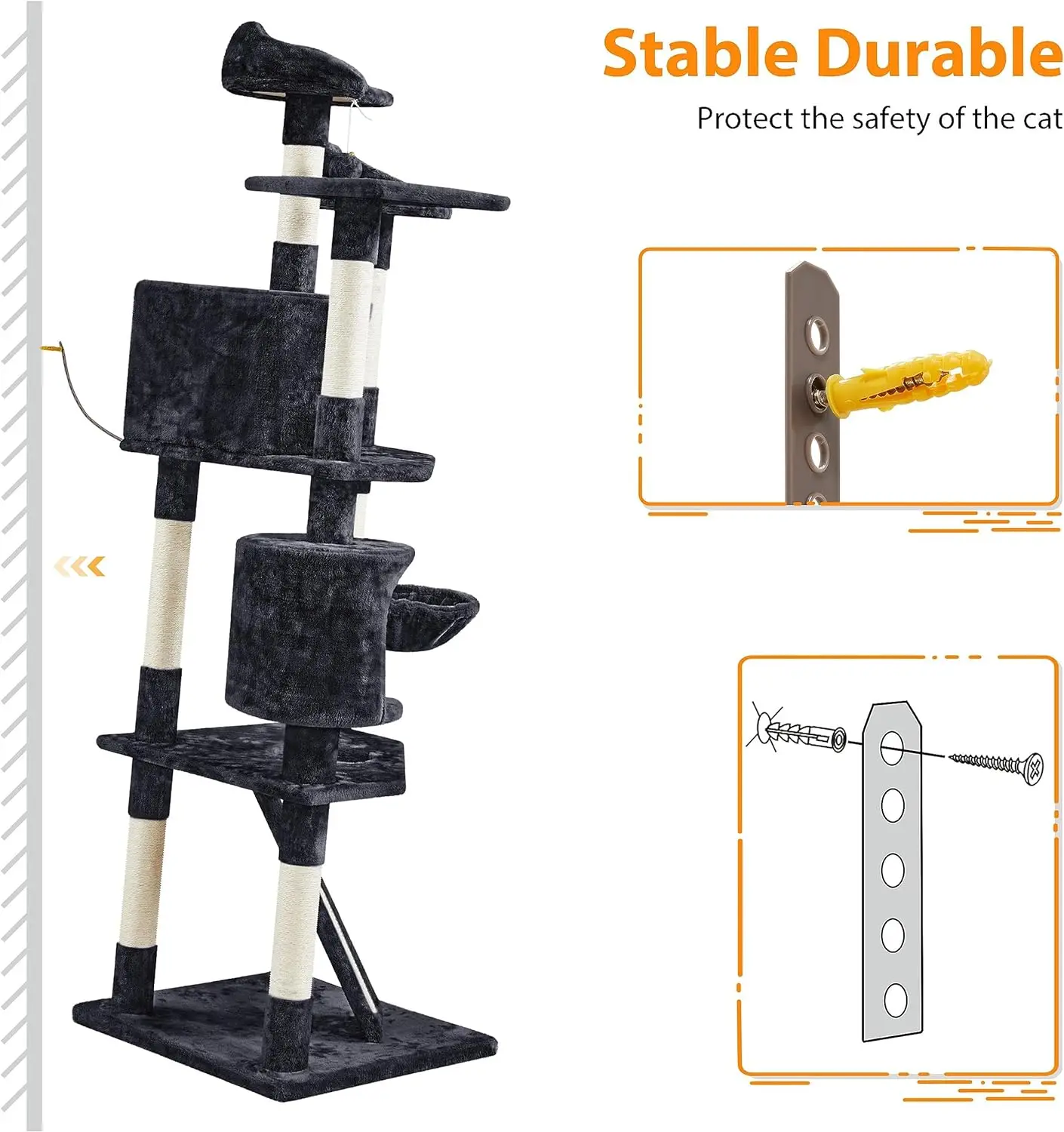 - 【Pet-friendly Materials】 Crafted of pet-safe manufactured wood and soft plush fabric covering, the tall cat tree tower will provide your beloved pets with a safe living and playing space.