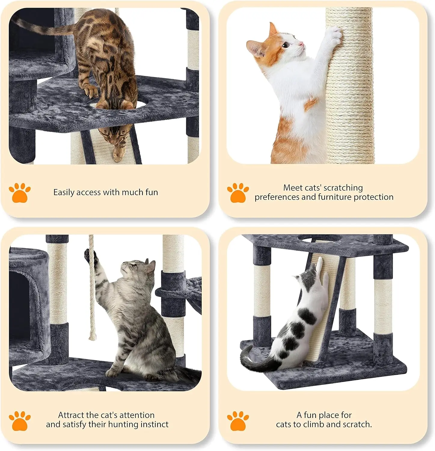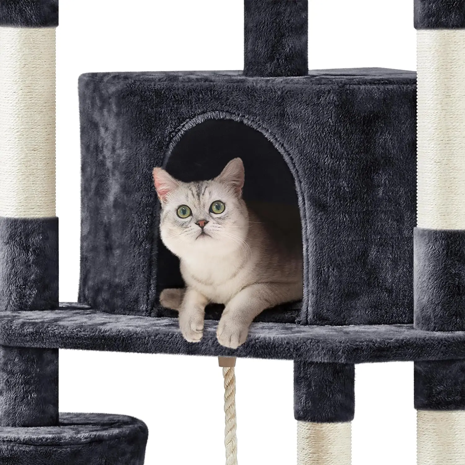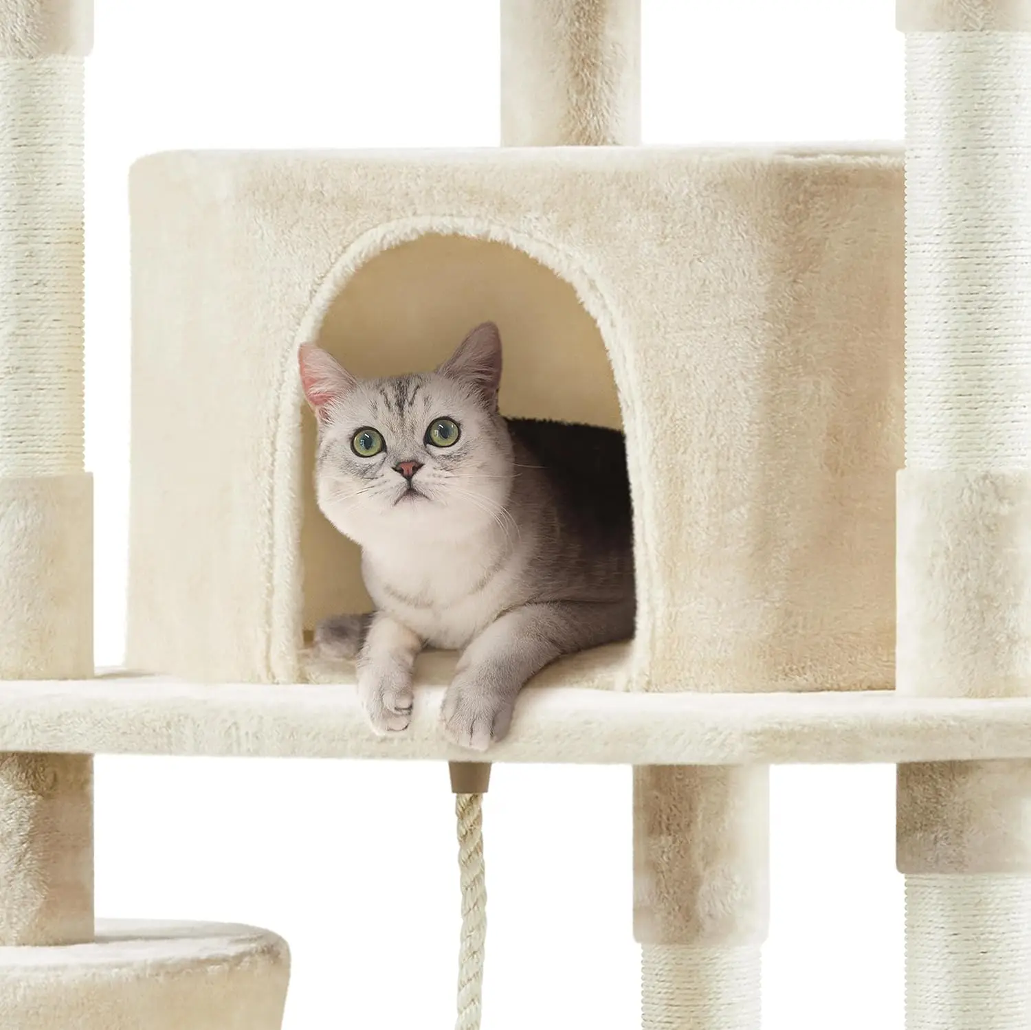 - 【Pet-friendly Materials】 Crafted of pet-safe manufactured wood and soft plush fabric covering, the tall cat tree tower will provide your beloved pets with a safe living and playing space.