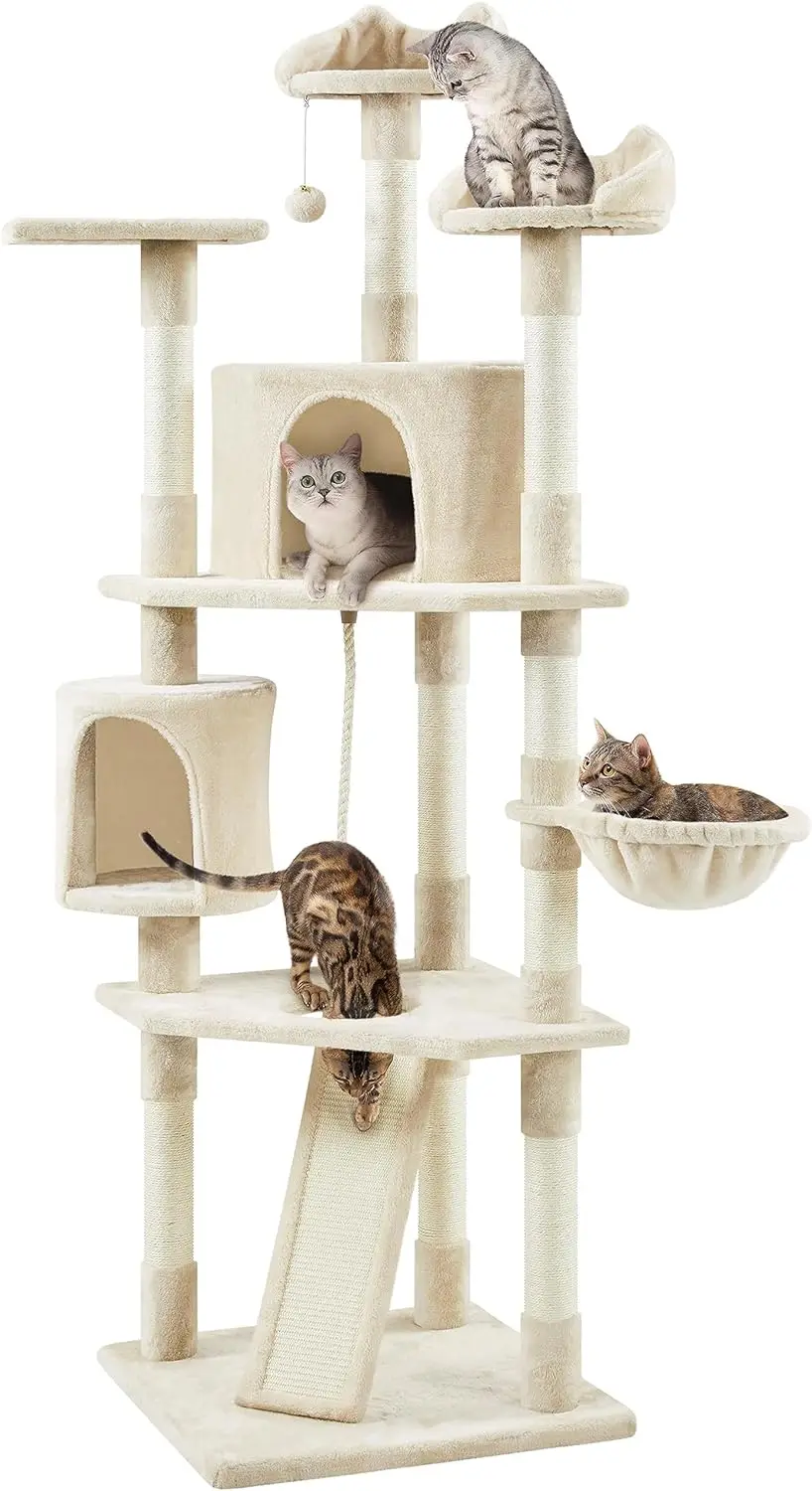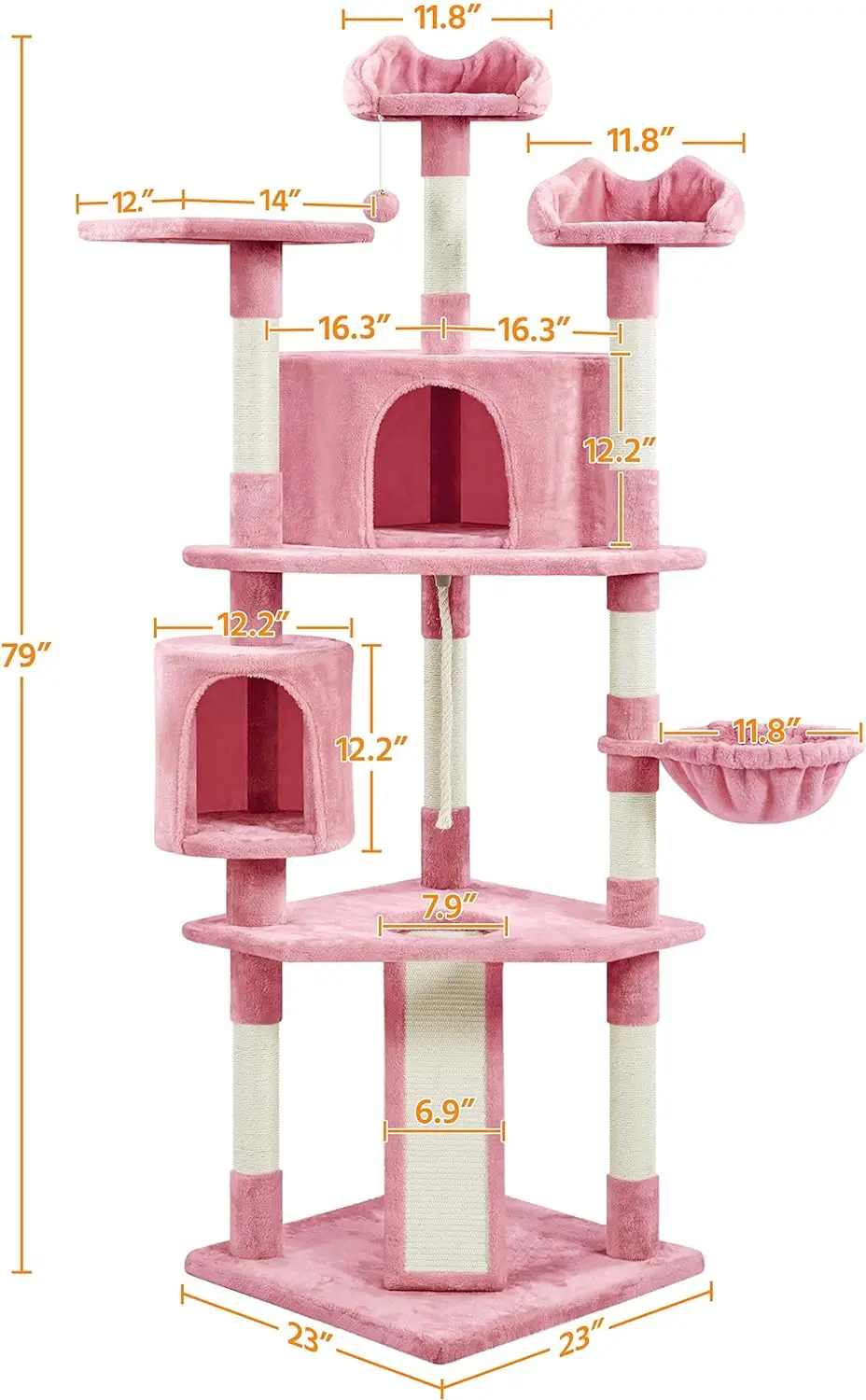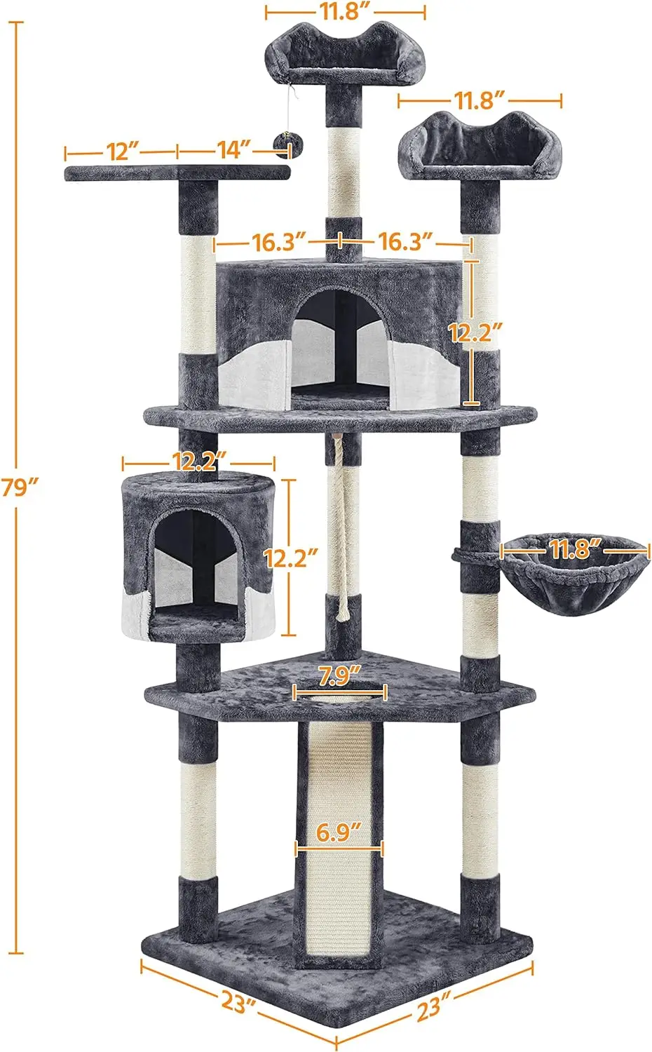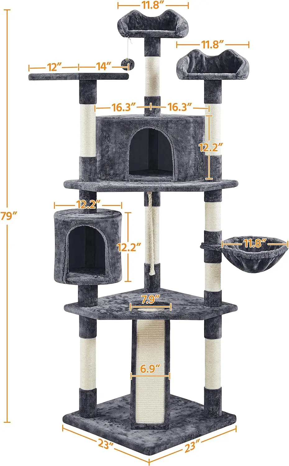 - 【Multilevel Cat Tree 】This 79'' cat tree allows small- to medium-sized cats to play at the same time. Its multilevel design expands the usable activity space vertically and offers more room for pets to climb and explore in the house.